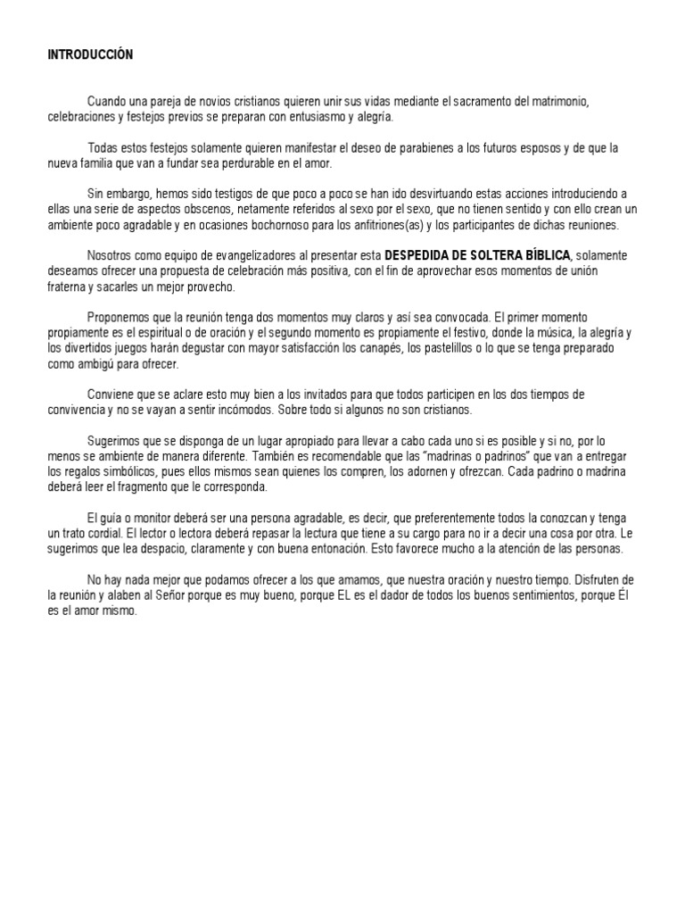 y festejos previos se preparan con entusiasmo y alegra. Todas estos festejos solamente quieren manifestar el deseo de parabienes a los futuros esposos y de que la nueva familia que van a fundar sea perdurable en el amor. Sin embargo, hemos sido testigos de que poco a poco se han ido desvirtuando estas acciones introduciendo a ellas una serie de aspectos obscenos, netamente referidos al sexo por el sexo, que no tienen sentido y con ello crean un ambiente poco agradable y en ocasiones bochornoso para los anfitriones(as) y los participantes de dichas reuniones. Nosotros como equipo de evangelizadores al presentar esta DESPEDIDA DE SOLTERA BBLICA, solamente deseamos ofrecer una propuesta de celebracin ms positiva, con el fin de aprovechar esos momentos de unin fraterna y sacarles un mejor provecho. Proponemos que la reunin tenga dos momentos muy claros y as sea convocada. El primer momento propiamente es el espiritual o de oracin y el segundo momento es propiamente el festivo, donde la msica, la alegra y los divertidos juegos harn degustar con mayor satisfaccin los canaps, los pastelillos o lo que se tenga preparado como ambig para ofrecer. Conviene que se aclare esto muy bien a los invitados para que todos participen en los dos tiempos de convivencia y no se vayan a sentir incmodos. Sobre todo si algunos no son cristianos. Sugerimos que se disponga de un lugar apropiado para llevar a cabo cada uno si es posible y si no, por lo menos se ambiente de manera diferente. Tambin es recomendable que las madrinas o padrinos que van a entregar los regalos simblicos, pues ellos mismos sean quienes los compren, los adornen y ofrezcan. Cada padrino o madrina deber leer el fragmento que le corresponda. El gua o monitor deber ser una persona agradable, es decir, que preferentemente todos la conozcan y tenga un trato cordial. El lector o lectora deber repasar la lectura que tiene a su cargo para no ir a decir una cosa por otra. Le sugerimos que lea despacio, claramente y con buena entonacin. Esto favorece mucho a la atencin de las personas. No hay nada mejor que podamos ofrecer a los que amamos, que nuestra oracin y nuestro tiempo. Disfruten de la reunin y alaben al Seor porque es muy bueno, porque EL es el dador de todos los buenos sentimientos, porque l es el amor mismo.