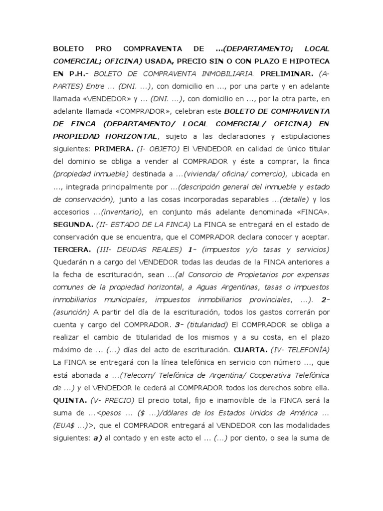 COMERCIAL; OFICINA) USADA, PRECIO SIN O CON PLAZO E HIPOTECA EN P.H.- BOLETO DE COMPRAVENTA INMOBILIARIA. PRELIMINAR. (APARTES) Entre ... (DNI. ...), con domicilio en ..., por una parte y en adelante llamada VENDEDOR y ... (DNI. ...), con domicilio en ..., por la otra parte, en adelante llamada COMPRADOR, celebran este BOLETO DE COMPRAVENTA DE FINCA (DEPARTAMENTO/ LOCAL COMERCIAL/ OFICINA) EN PROPIEDAD HORIZONTAL, sujeto a las declaraciones y estipulaciones siguientes: PRIMERA. (I- OBJETO) El VENDEDOR en calidad de nico titular del dominio se obliga a vender al COMPRADOR y ste a comprar, la finca (propiedad inmueble) destinada a ...(vivienda/ oficina/ comercio), ubicada en ..., integrada principalmente por ...(descripcin general del inmueble y estado de conservacin), junto a las cosas incorporadas separables ...(detalle) y los accesorios ...(inventario), en conjunto ms adelante denominada FINCA. SEGUNDA. (II- ESTADO DE LA FINCA) La FINCA se entregar en el estado de conservacin que se encuentra, que el COMPRADOR declara conocer y aceptar. TERCERA. (III- DEUDAS REALES) 1- (impuestos y/o tasas y servicios) Quedarn n a cargo del VENDEDOR todas las deudas de la FINCA anteriores a la fecha de escrituracin, sean ...(al Consorcio de Propietarios por expensas comunes de la propiedad horizontal, a Aguas Argentinas, tasas o impuestos inmobiliarios municipales, impuestos inmobiliarios provinciales, ...). 2(asuncin) A partir del da de la escrituracin, todos los gastos corrern por cuenta y cargo del COMPRADOR. 3- (titularidad) El COMPRADOR se obliga a realizar el cambio de titularidad de los mismos y a su costa, en el plazo mximo de ... (...) das del acto de escrituracin. CUARTA. (IV- TELEFONA) La FINCA se entregar con la lnea telefnica en servicio con nmero ..., que est abonada a ...(Telecom/ Telefnica de Argentina/ Cooperativa Telefnica de ...) y el VENDEDOR le ceder al COMPRADOR todos los derechos sobre ella. QUINTA. (V- PRECIO) El precio total, fijo e inamovible de la FINCA ser la suma de ...<pesos ... ($ ...)/dlares de los Estados Unidos de Amrica ... (EUA$ ...)>, que el COMPRADOR entregar al VENDEDOR con las modalidades siguientes: a) al contado y en este acto el ... (...) por ciento, o sea la suma de