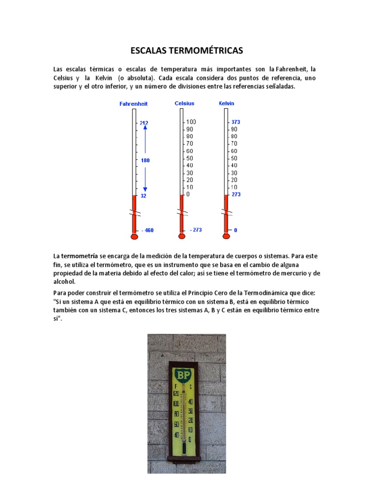 Las escalas trmicas o escalas de temperatura ms importantes son la Fahrenheit, la Celsius y la Kelvin (o absoluta). Cada escala considera dos puntos de referencia, uno superior y el otro inferior, y un nmero de divisiones entre las referencias sealadas.