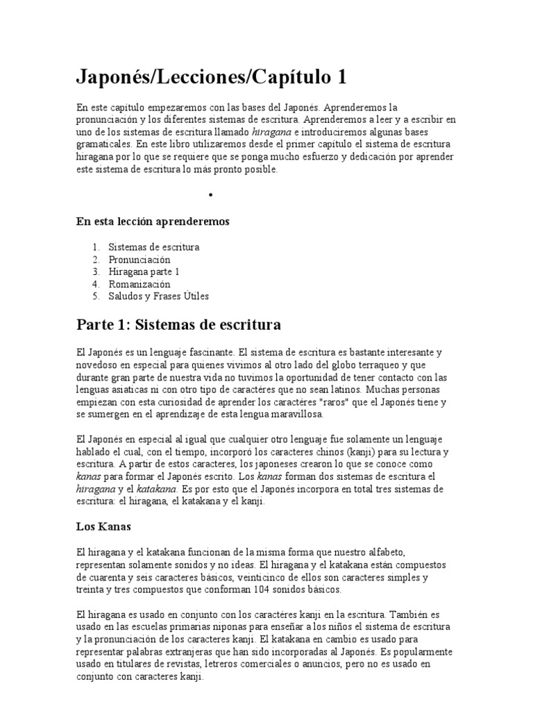 En este captulo empezaremos con las bases del Japons. Aprenderemos la pronunciacin y los diferentes sistemas de escritura. Aprenderemos a leer y a escribir en uno de los sistemas de escritura llamado hiragana e introduciremos algunas bases gramaticales. En este libro utilizaremos desde el primer captulo el sistema de escritura hiragana por lo que se requiere que se ponga mucho esfuerzo y dedicacin por aprender este sistema de escritura lo ms pronto posible.