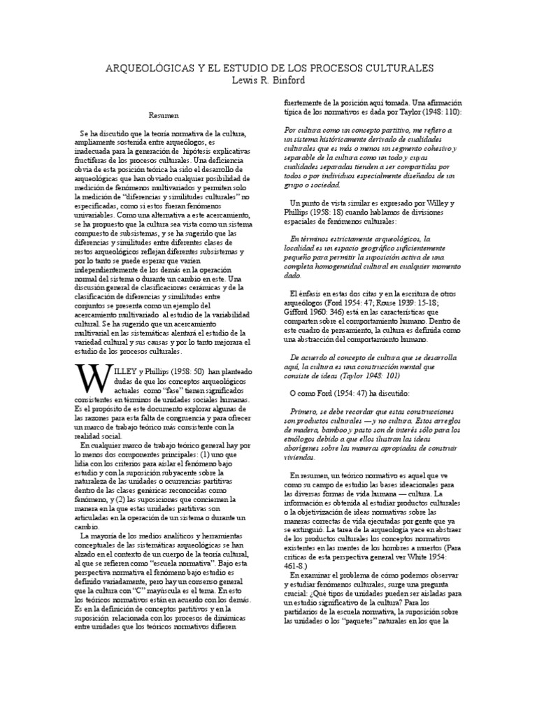 cultura se desarrolla son dependientes sobre suposiciones acerca de las dinmicas de transmisin ideacional. El aprendizaje es la base reconocida de la transmisin cultural entre generaciones y la difusin la base de transmisin entre unidades sociales no conectadas por comportamientos de crianza regulares. El corolario de esta proposicin es que la cultura es transmitida entre generaciones y a travs de las poblaciones en crianza en proporcin inversa al grado de distancia social mantenido en los grupos en cuestin. Dado que la cultura es vista como un gran todo transmitido a travs del tiempo y el espacio, cualquier intento de romper este todo cultural es considerado arbitrario y pensado como un expediente metodolgico (Ford 1954: 51; Brew 1946: 49) La particin de la cultura es a menudo catalogada como un aparato heurstico para medir el grado de distancia social entre los grupos cuyos productos culturales estn siendo observados. (Una excelente de esta perspectiva se encuentra en Spaulding 1957: 85 7). Las discontinuidades espaciales en la distribucin de caractersticas formales similares son percibidas como ya sea el resultado de (1) barreras naturales para interacciones sociales, o (2) la presencia de un sistema de valores que provee una matriz sicolgica conservativa que inhibe la aceptacin de cualidades externas, o (3) la migracin o intrusin en el rea de nuevas personas que perturban el diseo anterior de interaccin social. Los cambios formales en la distribucin temporal de objetos son vistos como el resultado de innovaciones o la operacin de una dinmica creada designada a veces como desvo (Ford 1954: 51; Herskovits 1948; 581 2).( Para crtica de este concepto, vea Binford 1963: 89 93.) Tanto innovacin como desvo son considerados naturales a la cultura y, como Caldwell (1958: 1) ha dicho: mientras las dems cosas sigan siendo iguales, los cambios en la cultura material a travs del tiempo y espacio tendern a ser regulares. Las discontinuidades en rangos de cambio o en una continuidad formal a travs del tiempo son vistas como el resultado de eventos histricos que tienden a cambiar la configuracin de unidades sociales a travs de mecanismos tales como extensiones del intercambio, migracin y la difusin de ideas centrales tales como los cultos religiosos (Ritchie 1955). Diferencias y similitudes culturales son expresadas por la escuela normativa en trminos de relaciones culturales, lo que, tratado en rigor, se divide en uno modelo interpretativo general. Este modelo se basa en la suposicin de un centro cultural en donde, por razones no especificadas, la tasa de innovacin exceden los de las reas que lo rodean. La nueva cultura se esparce desde el centro y se mezcla con las culturas de los alrededores hasta que se disipa en los bordes, creando culturas marginales. Las relaciones culturales son vistas como el grado de influencia mutua o unilateral ejercido entre centros culturales o subcentros. Este marco de trabajo interpretativo implica lo que yo eleg llamar la perspectiva acutica de la cultura. La literatura interpretativa abunda en frases como corriente cultural y en referencias al flujo de los