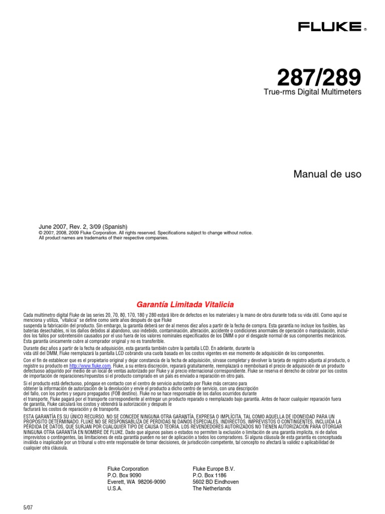Lea la seccin Informacin sobre seguridad antes de utilizar este multmetro. Las descripciones e instrucciones que aparecen en este manual se aplican a los multmetros digitales de verdadero valor eficaz modelos 289 y 287 (en adelante, el multmetro). El modelo 289 es el que aparece en todas las ilustraciones.