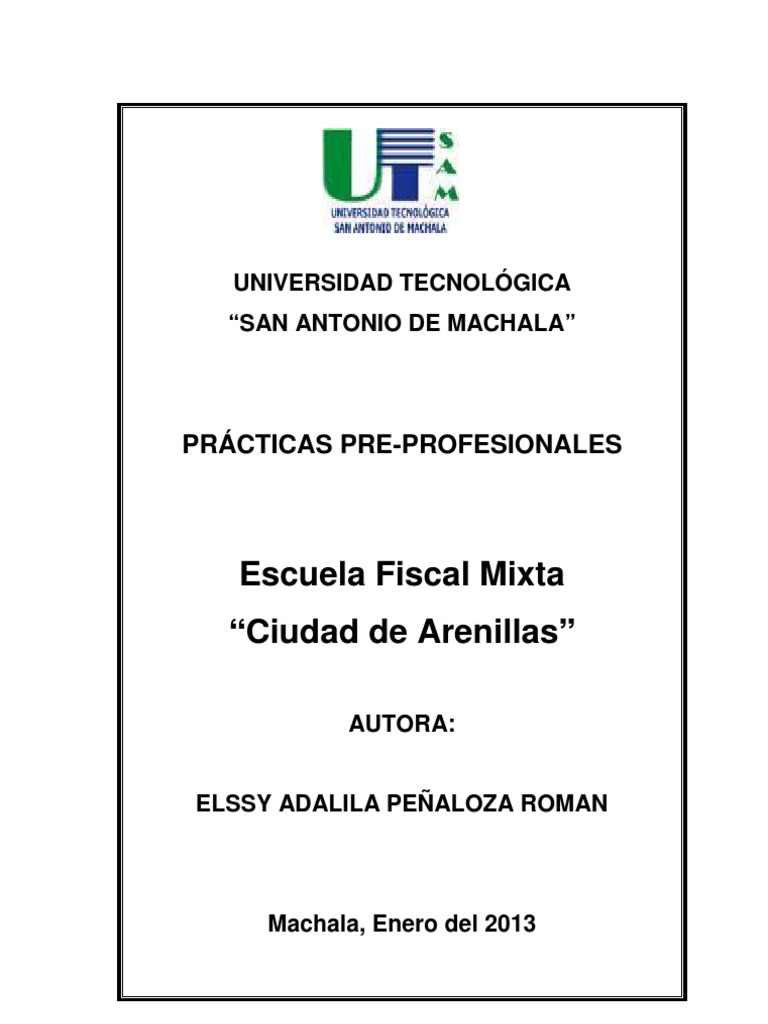 NOMBRE DEL ESTUDIANTE: Elssy Adalila Pealoza Romn SEMESTRE: Seminario de Titulacin NOMBRE DE LA INSTITUCIN: Escuela Fiscal Mixta Ciudad de Arenillas FUNCIN ASIGNADA: Prof. Del Quinto ao de Educacin Bsica paralelo B