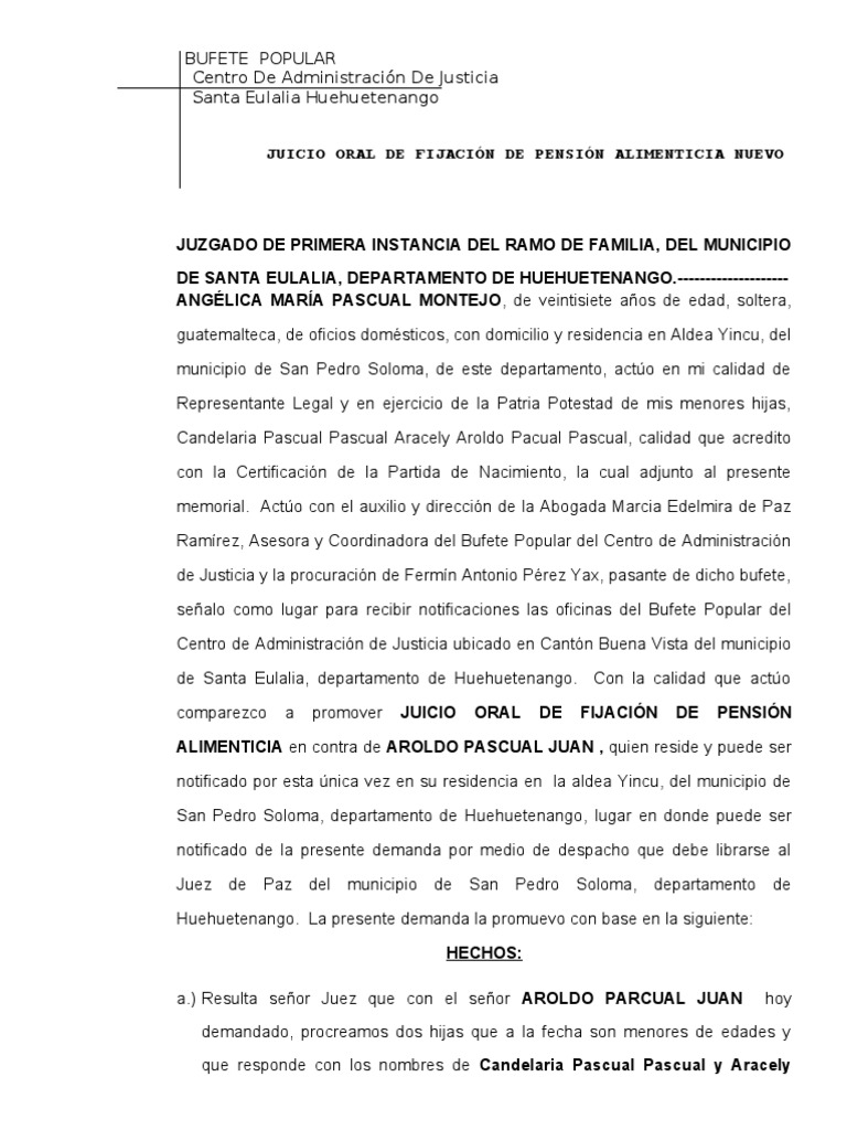 JUZGADO DE PRIMERA INSTANCIA DEL RAMO DE FAMILIA, DEL MUNICIPIO DE SANTA EULALIA, DEPARTAMENTO DE HUEHUETENANGO.-------------------ANGLICA MARA PASCUAL MONTEJO , de veintisiete aos de edad, soltera, guatemalteca, de oficios domsticos, con domicilio y residencia en Aldea Yincu, del municipio de San Pedro Soloma, de este departamento, acto en mi calidad de Representante Legal y en ejercicio de la Patria Potestad de mis menores hijas, Candelaria Pascual Pascual Aracely Aroldo Pacual Pascual, calidad que acredito con la Certificacin de la Partida de Nacimiento, la cual adjunto al presente memorial. Acto con el auxilio y direccin de la Abogada Marcia Edelmira de Paz Ramrez, Asesora y Coordinadora del Bufete Popular del Centro de Administracin de Justicia y la procuracin de Fermn Antonio Prez Yax, pasante de dicho bufete, sealo como lugar para recibir notificaciones las oficinas del Bufete Popular del Centro de Administracin de Justicia ubicado en Cantn Buena Vista del municipio de Santa Eulalia, departamento de Huehuetenango. Con la calidad que acto comparezco a promover JUICIO ORAL DE FIJACIN DE PENSIN