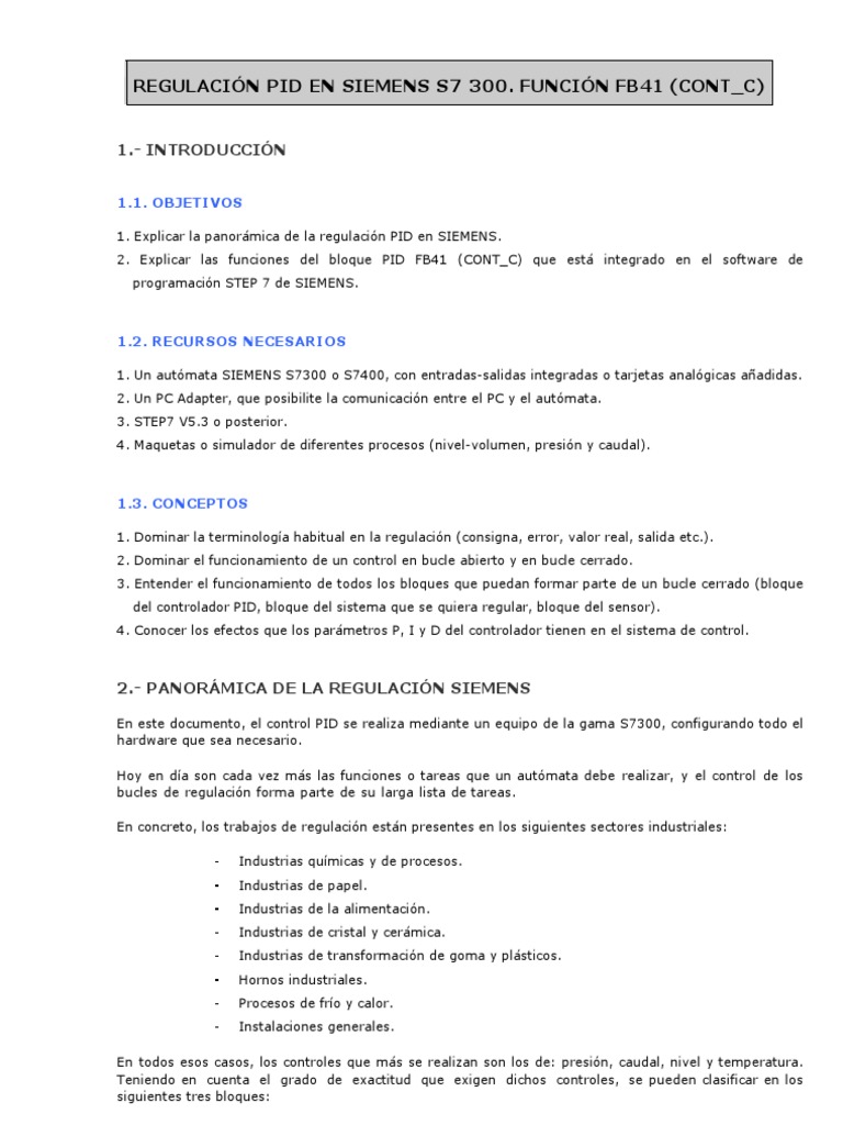 1. Explicar la panormica de la regulacin PID en SIEMENS. 2. Explicar las funciones del bloque PID FB41 (CONT_C) que est integrado en el software de programacin STEP 7 de SIEMENS.