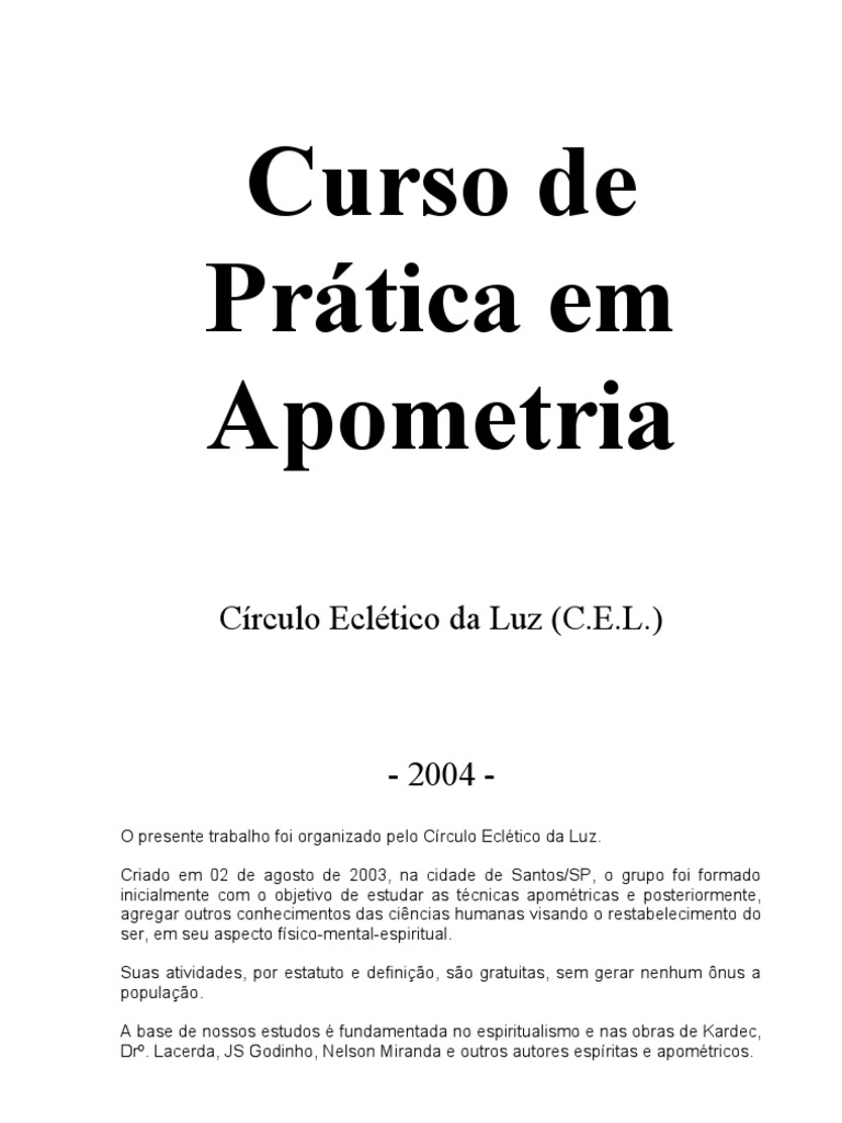 - 2004 O presente trabalho foi organizado pelo Crculo Ecltico da Luz. Criado em 02 de agosto de 2003, na cidade de Santos/SP, o grupo foi formado inicialmente com o objetivo de estudar as tcnicas apomtricas e posteriormente, agregar outros conhecimentos das cincias humanas visando o restabelecimento do ser, em seu aspecto fsico-mental-espiritual. Suas atividades, por estatuto e definio, so gratuitas, sem gerar nenhum nus a populao. A base de nossos estudos fundamentada no espiritualismo e nas obras de Kardec, Dr. Lacerda, JS Godinho, Nelson Miranda e outros autores espritas e apomtricos.