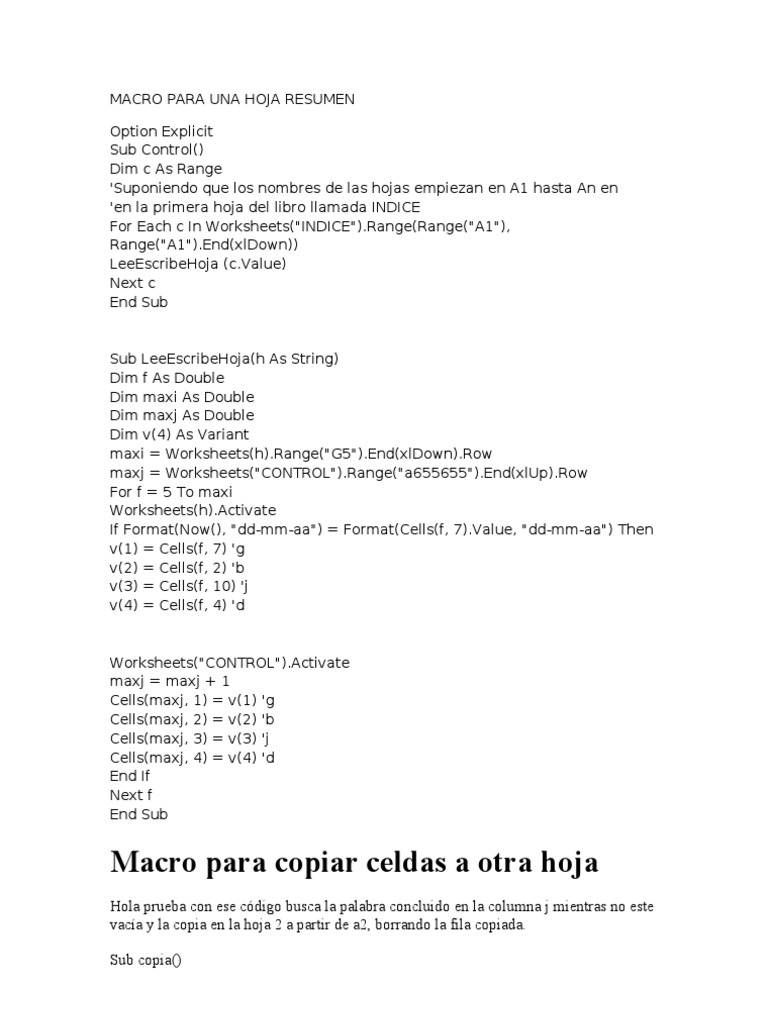 de las hojas empiezan en A1 hasta An en 'en la primera hoja del libro llamada INDICE For Each c In Worksheets("INDICE").Range(Range("A1"), Range("A1").End(xlDown)) LeeEscribeHoja ([Link]) Next c End Sub