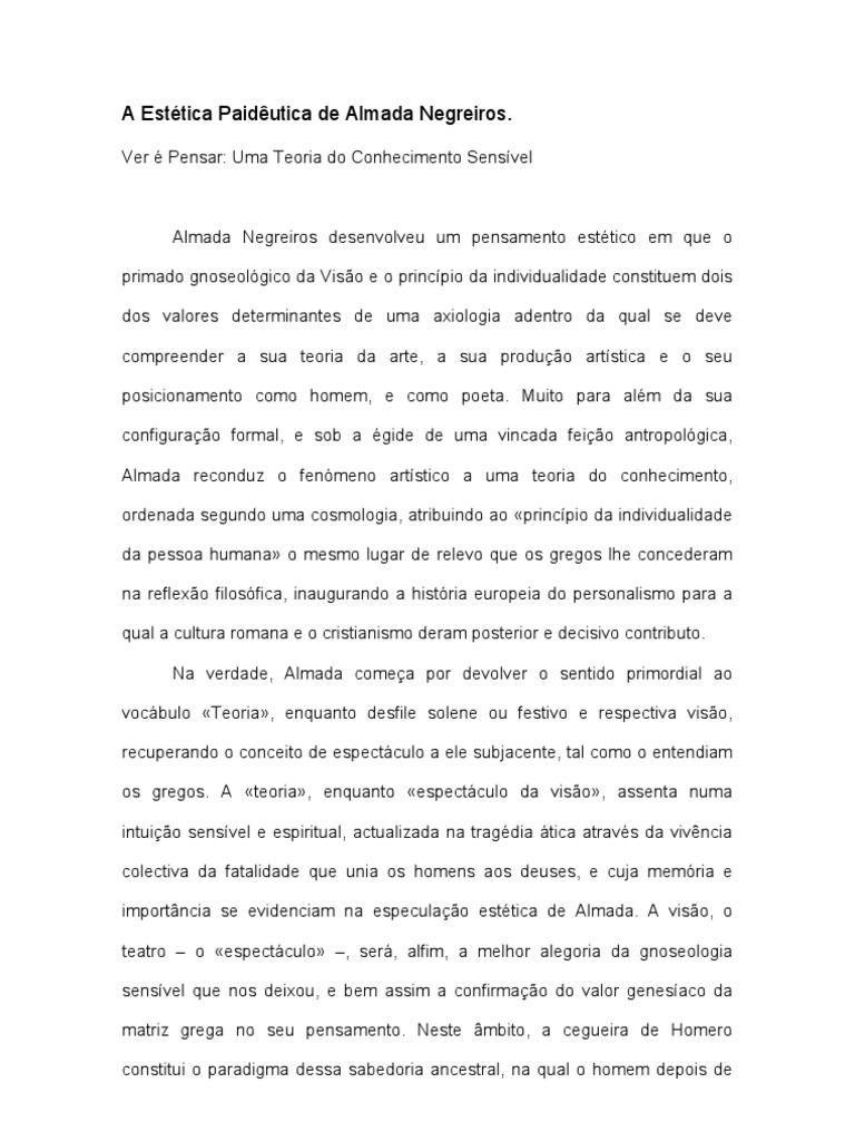continua a ser intrprete de algo que lhe originariamente anterior, convertendo-o, em relao obra, como que no actor em relao ao autor. Este postulado se por um lado refora o inexorvel carcter mimtico do mundo criado pelo homem, por outro, demonstra que a obra, como interpretao da Causa Criadora, no obra, mas apenas possibilidade de aco, isto , a adivinhao de um caminho que possibilita e torna livre a aco criadora, o que, no limite, leva subsuno do autor prpria obra, ou seja, desvenda no homem o poeta: na criao prpria do homem, a obra, o autor continuar sempre a ser o intrprete do que lhe originariamente anterior, como o actor intrprete do autor, pois absolutamente nada que seja criao prpria do homem pode alguma vez ser causa de aco sequer do prprio autor, pois toda a criao do homem, a sua obra, no de maneira nenhuma aco mas legtima possibilidade de aco27. Neste mbito, Almada corrobora ainda que a misso do pintor no apurar os pincis e as telas, pois que o tempo disso se encarregar, mas apurar-se a si mesmo, fazer de si prprio a obra-prima da criao, o homem28, postulado que converte a esttica almadina numa verdadeira tica, confirmando o tributo que o seu pensamento presta de igual modo ao platonismo. Nesta medida, por via dos cinco sentidos, inseparveis na unidade individual humana, que o homem espontaneamente conhece o universo, dando cumprimento perfectibilidade que inere captao da natureza do Todo; se o Todo criado perfeito, a captao das relaes no Todo perfectvel, abrindo-