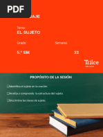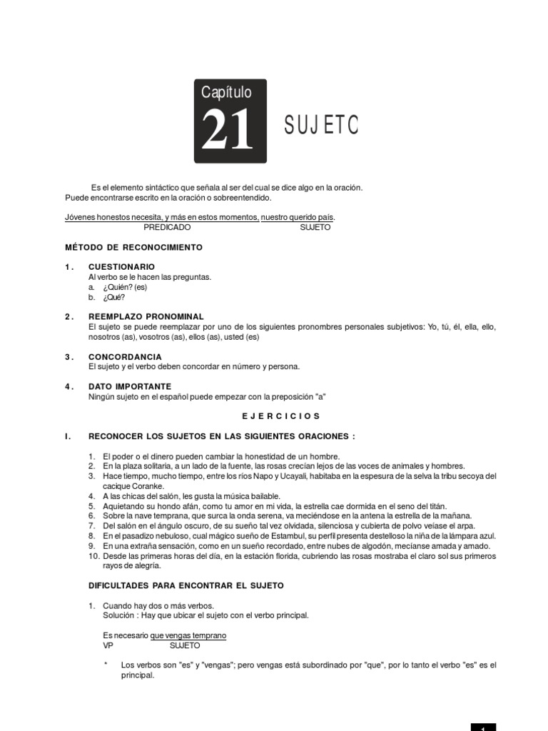RECONOCER LOS SUJETOS EN LAS SIGUIENTES ORACIONES : 1. El poder o el dinero pueden cambiar la honestidad de un hombre. 2. En la plaza solitaria, a un lado de la fuente, las rosas crecan lejos de las voces de animales y hombres. 3. Hace tiempo, mucho tiempo, entre los ros Napo y Ucayali, habitaba en la espesura de la selva la tribu secoya del cacique Coranke. 4. A las chicas del saln, les gusta la msica bailable. 5. Aquietando su hondo afn, como tu amor en mi vida, la estrella cae dormida en el seno del titn. 6. Sobre la nave temprana, que surca la onda serena, va mecindose en la antena la estrella de la maana. 7. Del saln en el ngulo oscuro, de su sueo tal vez olvidada, silenciosa y cubierta de polvo vease el arpa. 8. En el pasadizo nebuloso, cual mgico sueo de Estambul, su perfil presenta destelloso la nia de la lmpara azul. 9. En una extraa sensacin, como en un sueo recordado, entre nubes de algodn, mecanse amada y amado. 10. Desde las primeras horas del da, en la estacin florida, cubriendo las rosas mostraba el claro sol sus primeros rayos de alegra. DIFICULTADES PARA ENCONTRAR EL SUJETO 1. Cuando hay dos o ms verbos. Solucin : Hay que ubicar el sujeto con el verbo principal. Es necesario que vengas temprano VP SUJETO * Los verbos son "es" y "vengas"; pero vengas est subordinado por "que", por lo tanto el verbo "es" es el principal.