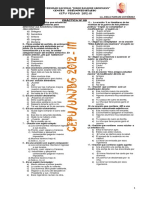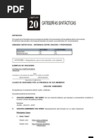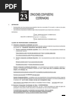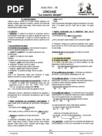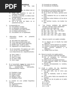 c) adverbio - ncleo d) adjetivo - circunstancial e) sustantivo - objeto directo 16. En qu alternativa se encuentra subrayado correctamente el sujeto? a) Los que beben demasiado acortan sus vidas b) Veinte personas haba. c) Pepito, termina la tarea. d) Preguntaban por sus hijos tres mujeres muy ancianas. e) Quienes siembran hoy cosecharn maana. "Maana celebraremos nuestro gran triunfo, seores". El sujeto es: a) Positivo b) Expreso c) Tcito d) Compuesto e) Complejo Slo l es mi gran amor real. El sujeto es: a) Simple - expreso - incomplejo b) Compuesto - tcito - incomplejo c) Simple - expreso - incomplejo d) Simple - tcito - incomplejo e) Compuesto - expreso - complejo A mis hijos, les regalar para navidad una motocicleta. El ncleo del sujeto es: a) Hijos b) Navidad c) Motocicleta d) Tcito e) No hay ncleo del Sujeto El modificador indirecto est encabezado comunmente por: a) Adverbio b) Preposicin c) Conjuncin d) Pronombre e) Artculo "Causan muchos accidentes en la carretera los vehculos sin control". Lo subrayado sintcticamente es: a) Agente b) Pvo c) M Directo d) A Posicin e) M. Indirecto Cul de las siguientes palabras no pueden ser ncleo del sujeto? a) Ello b) Cantar c) Vivido d) Pensado e) Pensando El Papa se los envi en la primera oportunidad. La estructura de la oracin respectivamente es: a) MD - OD - OI - NP - CT b) MD - NS - OI - OD - NP - CT c) MD - NS - NP - OD - OD - CT d) MD - NS - CT - OI - OD - NP e) MD - NS - NP - OI - OD - CT Este ramo de flores se lo debes entregar a ella por su cumpleaos. La estructura de la oracin es: a) Suj. tcito - OD - OD - OI - NP - OI - CIRC (C) b) Suj. tcito - OD - OI - OD - NP - OI - CIRC (C) c) MD - MI - NS - OI - OI - OD - NP - OD - CIRC (T) d) NS - MI - Ag - OD - OI - NP - APOS - CIR (L) e) MD - NS - MI - Ag - OI - OD - NP - APOS - CIR (M) 27. 25. Los magistrados fueron absueltos por la Corte Suprema. La expresin subrayada desempea la funcin de: a) O DIR b) O INDIR c) PVO d) Agente e) Aposicin En las siguientes oraciones, cules son los sujetos? "Me gusta el gatito" y "A nosotros nos gusta muchsimo el helado": a) Me - Nosotros b) El gatito - Nosotros c) El gatito - el helado d) Me - gusta e) Gatito - muchsimo No este verano yo no ir contigo a Chiclayo. Identifique la estructura sintctica de la oracin: a) CIR (N) - CIR (L) - NS - CIR (N) - NP - CIRC (C) CIR (T) b) CIR (N) - CIR (T) - NS - CIR (N) - NP - CIR (C) CIR (M) c) CIR (N) - CIR (M) - NS - CIR (N) - NP - CIR (C) CIR (L) d) CIR (N) - CIR (T) - NS - CIR (N) - NP - CIR (COMP) - CIR (L) e) CIR (N) - CIR (T) - NS - CIR (T) - NP - CIR (L) - CIR (COMP) Oracin unimembre: a) El hombre que hace que las cosas difciles parezcan fciles es un buen educador. b) El remedio ms adecuado para este embarazoso problema est en tus manos. c) A los ladrones como sos ninguna autoridad humana ni ley alguna pueden detenerlos. d) El viejo auto de mi primo Jos ha sido arreglado en el taller. e) Javier, es tarde. Marque lo correcto: El sintagma MI MEJOR ALUMNO es sujeto en: I. Lamentablemente desaprob a mi mejor alumno. II. En la clase mi mejor alumno, siempre conversa. III. Daro, mi mejor alumno, ingres a UNMSM. IV. Por la calle oscura, caminaba mi mejor alumno a) Slo I b) II y III c) I y IV d) Slo II e) II y IV El grupo de Teatro mont una obra del Renacimiento y en todas las represen-taciones, la respuesta del pblico fue excelente. Cules son los ncleos de los sujetos? a) Obra - respuesta b) Grupo - representaciones c) Teatro - respuesta d) Renacimiento - pblico e) Grupo - respuesta A las seis de la tarde, el centro de Lima. parece un agitado hormiguero. De la oracin anterior, es correcto: I. El sujeto es compuesto.