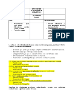 2.B Modificador Directo Es aquel que no usa enlace para conectarse al ncleo del sujeto. Los modificadores directos normalmente suelen ser los artculos y adjetivos, aunque tambin pueden ser modificadores directos las frases adjetivas y las proposiciones subordinadas adjetivas. 2.C Modificador Apositivo (en realidad no es un modificador) Es aquel que repite al ncleo del sujeto, convirtindose en su sinnimo sintctico. Si est entre comas es explicativa; si no, es especificativa. EJEMPLOS DE SUJETOS ANALIZADOS : A su boda fueron sus amigos y parientes. MD NS NS SUJETO Increblemente, ilumin nuestros rostros la claridad de la luna MD NS MI SUJETO Nunca existir en nuestra casa otra mascota como sa MD NS MI SUJETO Los giles y veloces caballos competirn hoy MD MD MD NS SUJETO Una muchacha muy servicial nos atendi en aquel lugar. MD NS MD SUJETO Francisco Pizarro, Conquistador del Per, captur a Atahualpa. NS APOSICIN SUJETO El MD poeta Vallejo muri en Pars. NS APOS. SUJETO