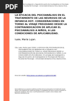 La crtica de Freud a la moderno conciencia racional del occidente es puede fundamental: significa que la conciencia no ser nunca el campo donde se hallan presentes los tenidos Con ms hondos y profundos que constituyen la verdadera consftuida dimensin del hombre, porque est sobre la represin de lo materno. El fundamento ignora maten-to de su vida, que la consciencia necesariamente por las vicisitudes de su origen, permanece inconscien te: no accede a la conciencia. Pero Freud tambin dice que la conciencia, con ser tan poco, es lo nico que tenemos para pensarnos sin saber el origen dramtio que tuvo que relegar fuede s misma. Porque el asesinato, aunque fan perisar taseado, la reaY para el nio. Pocos se detienen a palabra castracin, amenaza asesina y cruel que los hombres aplican al nio, refrendado por el terror de Estado en el adulto. La violencia primera contra s mismo Esta conformacin complej de Edipo imaginaria y estructurante del o en Freud se diferencia del planteo de Lacan. Porque Freud. que tiene presente el problema del dominio histrico,
