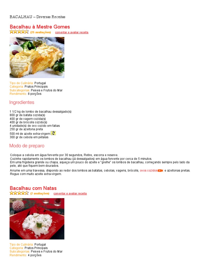 Tipo de Culinria: Portugal Categoria: Pratos Principais Subcategorias: Peixes e Frutos do Mar Rendimento: 8 pores