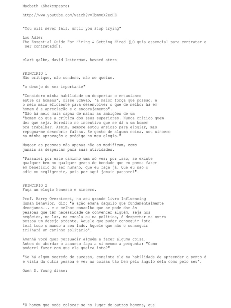 v=IbmmuX2ecHE "You will never fail, until you stop trying" Lou Adler The Essential Guide For Hiring & Getting Hired ( O guia essencial para contratar e ser contratado ). clark galbe, david letterman, howard stern PRINCIPIO 1 No critique, no condene, no se queixe. "o desejo de ser importante" "Considero minha habilidade em despertar o entusiasmo entre os homens", disse Schwab, "a maior fora que possuo, e o meio mais eficiente para desenvolver o que de melhor h em homem a apreciao e o encorajamento". "No h meio mais capaz de matar as ambies de um "homem do que a crtica dos seus superiores. Nunca critico quem der que seja. Acredito no incentivo que se d a um homem pra trabalhar. Assim, sempre estou ansioso para elogiar, mas repugna-me descobrir faltas. Se gosto de alguma coisa, sou sincero na minha aprovao e prdigo no meu elogio." Magoar as pessoas no apenas no as modificam, como jamais as despertam para suas atividades. "Passarei por este caminho uma s vez; por isso, se existe qualquer bem ou qualquer gesto de bondade que eu possa fazer em benefcio do ser humano, que eu faa j. Que eu no o adie ou negligencie, pois por aqui jamais passarei". PRINCIPIO 2 Faa um elogio honesto e sincero. Prof. Harry Overstreet, no seu grande livro Influencing Human Behavior, diz: "A ao emana daquilo que fundamentalmente desejamos... e o melhor conselho que se pode dar s pessoas que tm necessidade de convencer algum, seja nos negcios, no lar, na escola ou na poltica, despertar na outra pessoa um desejo ardente. Aquele que puder conseguir isto ter todo o mundo a seu lado. Aquele que no o conseguir trilhar um caminho solitrio". Amanh voc quer persuadir algum a fazer alguma coisa. Antes de abordar o assunto faa a si mesmo a pergunta: "Como poderei fazer com que ele queira isto?" "Se h algum segredo de sucesso, consiste ele na habilidade de apreender o ponto d e vista da outra pessoa e ver as coisas to bem pelo ngulo dela como pelo seu". Owen D. Young disse: