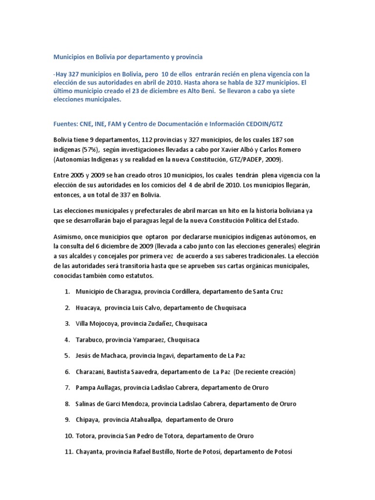 Fuentes: CNE, INE, FAM y Centro de Documentacin e Informacin CEDOIN/GTZ Bolivia tiene 9 departamentos, 112 provincias y 327 municipios, de los cuales 187 son indgenas (57%), segn investigaciones llevadas a cabo por Xavier Alb y Carlos Romero (Autonomas Indgenas y su realidad en la nueva Constitucin, GTZ/PADEP, 2009). Entre 2005 y 2009 se han creado otros 10 municipios, los cuales tendrn plena vigencia con la eleccin de sus autoridades en los comicios del 4 de abril de 2010. Los municipios llegarn, entonces, a un total de 337 en Bolivia. Las elecciones municipales y prefecturales de abril marcan un hito en la historia boliviana ya que se desarrollarn bajo el paraguas legal de la nueva Constitucin Poltica del Estado. Asimismo, once municipios que optaron por declararse municipios indgenas autnomos, en la consulta del 6 diciembre de 2009 (llevada a cabo junto con las elecciones generales) elegirn a sus alcaldes y concejales por primera vez de acuerdo a sus saberes tradicionales. La eleccin de las autoridades ser transitoria hasta que se aprueben sus cartas orgnicas municipales, conocidas tambin como estatutos. 1. Municipio de Charagua, provincia Cordillera, departamento de Santa Cruz 2. Huacaya, provincia Luis Calvo, departamento de Chuquisaca 3. Villa Mojocoya, provincia Zudaez, Chuquisaca 4. Tarabuco, provincia Yamparaez, Chuquisaca 5. Jess de Machaca, provincia Ingavi, departamento de La Paz 6. Charazani, Bautista Saavedra, departamento de La Paz (De reciente creacin) 7. Pampa Aullagas, provincia Ladislao Cabrera, departamento de Oruro 8. Salinas de Garci Mendoza, provincia Ladislao Cabrera, departamento de Oruro 9. Chipaya, provincia Atahuallpa, departamento de Oruro 10. Totora, provincia San Pedro de Totora, departamento de Oruro 11. Chayanta, provincia Rafael Bustillo, Norte de Potos, departamento de Potos