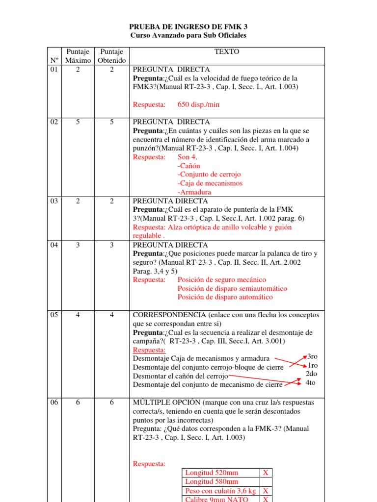 MLTIPLE OPCIN (marque con una cruz la/s respuestas correcta/s, teniendo en cuenta que le sern descontados puntos por las incorrectas) Pregunta: En qu piezas se encuentra el nmero de identificacin del armamento? (Manual RT-23-3 , Cap. I, Secc. I, Art. 1.004) Respuesta: Can X Culatn Cerrojo X Cola disparador Armadura X Cilindro de los gases MLTIPLE OPCIN (marque con una cruz la/s respuestas correcta/s, teniendo en cuenta que le sern descontados puntos por las incorrectas) Pregunta: Cules son las piezas que corresponden a la FMK 3 ? (Manual RT-23-3 , Cap. III, Secc.II, Art. 3.003) Respuesta: Retn de la tuerca del caon X Retn del culatn X Cubre llama Manivela de transporte Manivela de armar X Seguro de transporte MLTIPLE OPCIN (marque con una cruz la/s respuestas correcta/s, teniendo en cuenta que le sern descontados puntos por las incorrectas) Pregunta: Qu no se deber aceitar durante la limpieza y conservacin antes del tiro?(Manual RT-23-3 , Cap. IV, Secc.II, Art. 4.002) Respuesta: Guas interior y exterior del cerrojo Can X Gua exterior del caon Gua interior de la caja de mecanismos Cargador y elevador de cartuchos X Recmara X MLTIPLE OPCIN (marque con una cruz la/s respuestas correcta/s, teniendo en cuenta que le sern descontados puntos por las incorrectas) Pregunta: Cules son generalidades de la FMK-3? (Manual RT-23-3 , Cap. I, Secc. I, Art. 1.002)