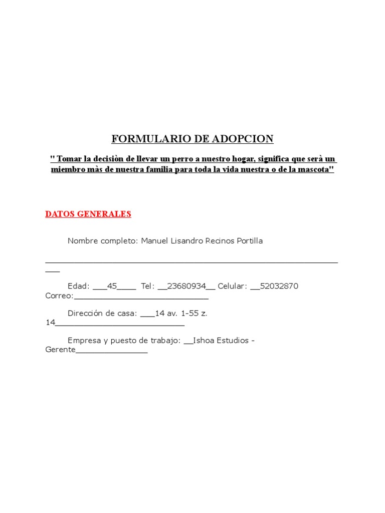 Yo:____Manuel Lisandro Recinos Portilla________ declaro que he ledo el presente Formulario de Adopcin y manifiesto que estoy de acuerdo con todas las disposiciones contenidas y acepto, ratifico y de conformidad. Firmo al pie del presente documento. Acepto que la mascota sea devuelta voluntariamente a la persona que me la di en adopcin si no cumplo con lo establecido.