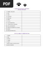 1. En dnde estar la mascota durante el da? Dentro de casa? Si___ Afuera de casa?_______ mts2 _________ horas:___________ Terraza _______ Patio o garaje abierto con visin al exterior_______, patio o garaje cerrado sin visin al exterior_______ Estar en contacto DIRECTO con humanos_24__ horas del da. 2. En donde dormir la mascota? Afuera (jardin) _______________ Adentro (casa) _Si______ Afuera (bajo techo) _____ (intemperie) ____ Donde? ________ 3. Tiene patio o jardn, atrs o delante de su casa?_Si Atrs y Adelante________________________________ 4. Alguna vez ha tenido o tiene mascotas: Cuantas? ___1____ y de que tipo?__Perrito_______ especie ___French______sexo F_________ especie_______________ sexo _____________ especie ________________sexo______________ especie_______________ sexo _____________