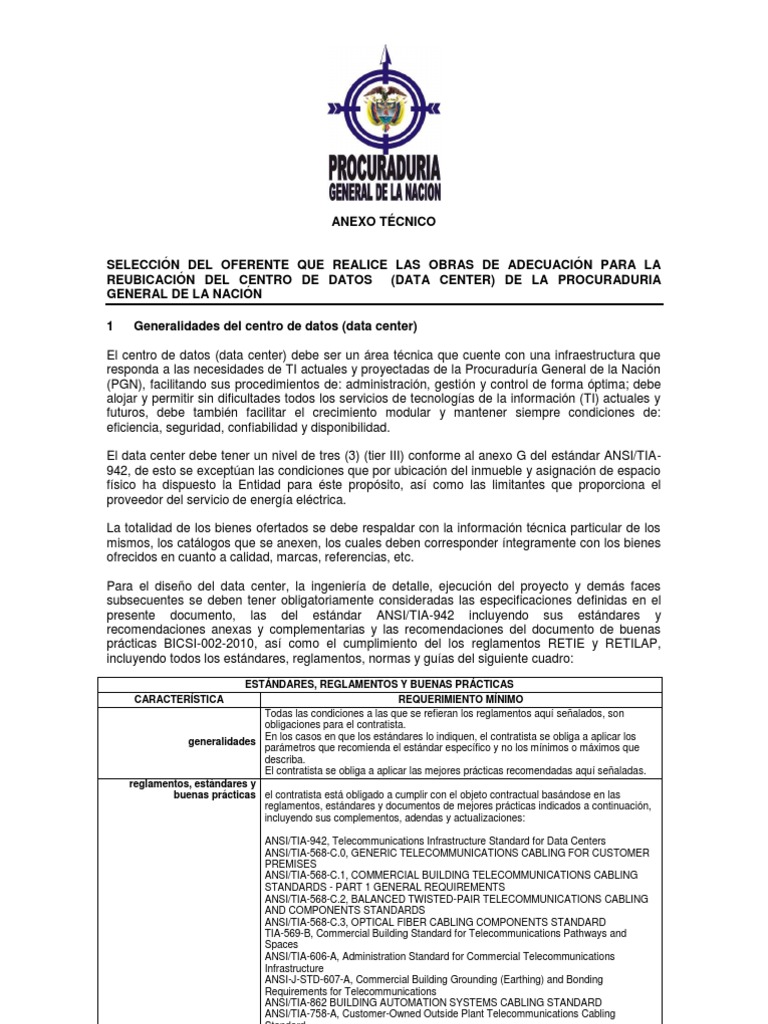 El centro de datos (data center) debe ser un rea tcnica que cuente con una infraestructura que responda a las necesidades de TI actuales y proyectadas de la Procuradura General de la Nacin (PGN), facilitando sus procedimientos de: administracin, gestin y control de forma ptima; debe alojar y permitir sin dificultades todos los servicios de tecnologas de la informacin (TI) actuales y futuros, debe tambin facilitar el crecimiento modular y mantener siempre condiciones de: eficiencia, seguridad, confiabilidad y disponibilidad. El data center debe tener un nivel de tres (3) (tier III) conforme al anexo G del estndar ANSI/TIA942, de esto se exceptan las condiciones que por ubicacin del inmueble y asignacin de espacio fsico ha dispuesto la Entidad para ste propsito, as como las limitantes que proporciona el proveedor del servicio de energa elctrica. La totalidad de los bienes ofertados se debe respaldar con la informacin tcnica particular de los mismos, los catlogos que se anexen, los cuales deben corresponder ntegramente con los bienes ofrecidos en cuanto a calidad, marcas, referencias, etc. Para el diseo del data center, la ingeniera de detalle, ejecucin del proyecto y dems faces subsecuentes se deben tener obligatoriamente consideradas las especificaciones definidas en el presente documento, las del estndar ANSI/TIA-942 incluyendo sus estndares y recomendaciones anexas y complementarias y las recomendaciones del documento de buenas prcticas BICSI-002-2010, as como el cumplimiento del los reglamentos RETIE y RETILAP, incluyendo todos los estndares, reglamentos, normas y guas del siguiente cuadro:
