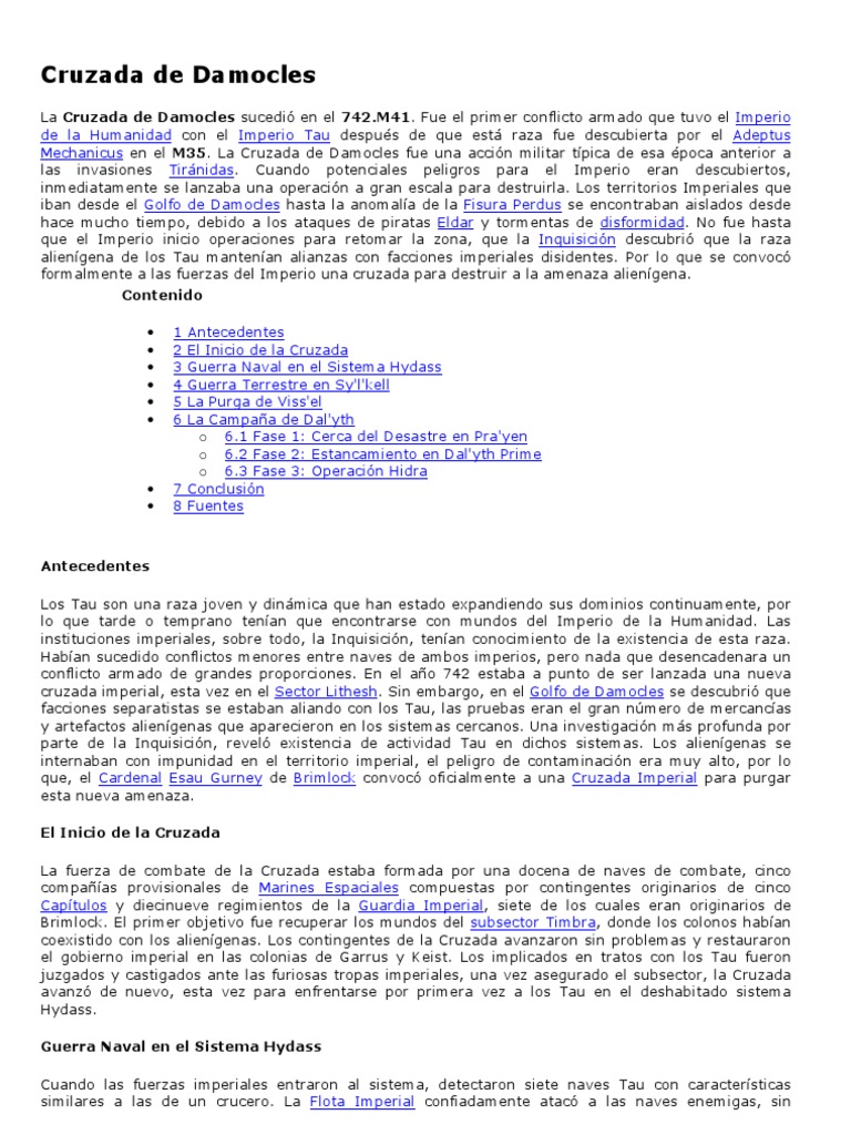 La Cruzada de Damocles sucedi en el 742.M41. Fue el primer conflicto armado que tuvo el Imperio de la Humanidad con el Imperio Tau despus de que est raza fue descubierta por el Adeptus Mechanicus en el M35. La Cruzada de Damocles fue una accin militar tpica de esa poca anterior a las invasiones Tirnidas. Cuando potenciales peligros para el Imperio eran descubiertos, inmediatamente se lanzaba una operacin a gran escala para destruirla. Los territorios Imperiales que iban desde el Golfo de Damocles hasta la anomala de la Fisura Perdus se encontraban aislados desde hace mucho tiempo, debido a los ataques de piratas Eldar y tormentas de disformidad. No fue hasta que el Imperio inicio operaciones para retomar la zona, que la Inquisicin descubri que la raza aliengena de los Tau mantenan alianzas con facciones imperiales disidentes. Por lo que se convoc formalmente a las fuerzas del Imperio una cruzada para destruir a la amenaza aliengena. Contenido 1 2 3 4 5 6 Antecedentes El Inicio de la Cruzada Guerra Naval en el Sistema Hydass Guerra Terrestre en Sy'l'kell La Purga de Viss'el La Campaa de Dal'yth o 6.1 Fase 1: Cerca del Desastre en Pra'yen o 6.2 Fase 2: Estancamiento en Dal'yth Prime o 6.3 Fase 3: Operacin Hidra 7 Conclusin 8 Fuentes