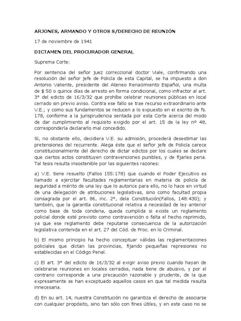 ARJONES, ARMANDO Y OTROS S/DERECHO DE REUNIN 17 de noviembre de 1941 DICTAMEN DEL PROCURADOR GENERAL Suprema Corte: Por sentencia