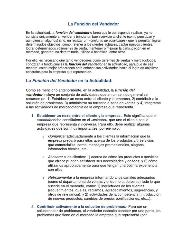 En la actualidad, la funcin del vendedor o tarea que le corresponde realizar, ya no consiste nicamente en vender y brindar un buen servicio al cliente (como pensaban y an piensan algunos) sino, en realizar un conjunto de actividades que le permitan lograr determinados objetivos, como: retener a los clientes actuales, captar nuevos clientes, lograr determinados volmenes de venta, mantener o mejorar la participacin en el mercado, generar una determinada utilidad o beneficio, entre otros. Por ello, es necesario que tanto vendedores como gerentes de ventas y mercadlogos, conozcan a fondo cul es la funcin del vendedor en la actualidad, para que de esa manera, estn mejor preparados para enfocar sus actividades hacia el logro de objetivos concretos para la empresa que representan.