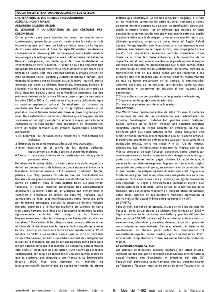 TITULO: TALLER LITERATURA PRECOLOMBINA LOS AZTECAS LA LITERATURA EN LOS PUEBLOS PRECOLOMBINOS AZTECAS, INCAS Y MAYAS ALEJANDRA GALLERO