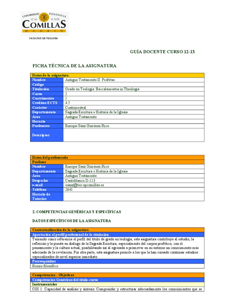 Datos del profesorado Profesor Nombre Enrique Sanz Gimnez-Rico Departamento Sagrada Escritura e Historia de la Iglesia rea Antiguo Testamento Despacho Cantoblanco D-113 e-mail esanz@teo.upcomillas.es Telfono 2641 Horario de Tutoras 2. COMPETENCIAS GENRICAS Y ESPECFICAS DATOS ESPECFICOS DE LA ASIGNATURA Contextualizacin de la asignatura Aportacin al perfil profesional de la titulacin Teniendo como referencia el perfil del ttulo de grado en teologa, esta asignatura contribuye al estudio, la reflexin y la puesta en dilogo de la Sagrada Escritura, especialmente del corpus proftico, con el pensamiento y la cultura actual, posibilitando as al egresado a promover en su entorno un conocimiento ms adecuado de la revelacin. Por otra parte, esta asignatura permite a los que la han cursado continuar estudios especializados de nivel superior inmediato. Prerrequisitos Bienio filosfico Competencias - Objetivos Competencias Genricas del ttulo-curso Instrumentales CGI 1: Capacidad de anlisis y sntesis. Comprender y estructurar adecuadamente los conocimientos que se