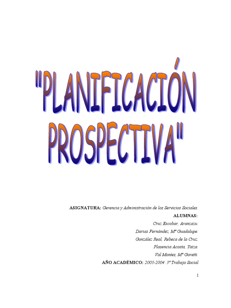 comprometidos a largo plazo, por lo tanto podemos considerar que tiene un efecto duradero1. Planificacin prospectiva: Supone la reflexin de los futuros posibles (el futuro no solo se asume sino se desea) y se interesa especialmente en la evolucin, en el cambio y en la dinmica de los sistemas sociales.
