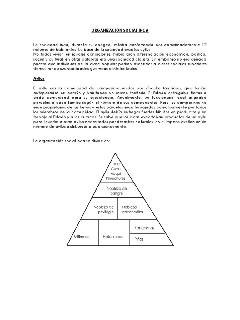 La base de la sociedad eran los ayllus. No todos vivan en iguales condiciones, haba gran diferenciacin econmica, poltica, social y cultural, en otras palabras era una sociedad clasista. Sin embargo no era cerrada puesto que individuos de la clase popular podan ascender a clases sociales superiores demostrando sus habilidades guerreras o intelectuales. Ayllus El ayllu era la comunidad de campesinos unidos por vnculos familiares, que tenan antepasados en comn y habitaban un mismo territorio. El Estado entregaba tierras a cada comunidad para su subsistencia. Anualmente, un funcionario local asignaba parcelas a cada familia segn el nmero de sus componentes. Pero los campesinos no eran propietarios de las tierras y estas parcelas eran trabajadas colectivamente por todos los miembros de la comunidad. El ayllu deba entregar fuertes tributos en productos y en trabajo al Estado y a los curacas. Se sabe que los incas exportaban productos de un ayllu para llevarlos a otros ayllus necesitados por desastres naturales, en el imperio existan un sin nmero de ayllus distribuidos proporcionalmente. La organizacin social inca se divide en: