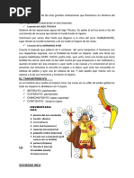 LA REALEZA Estuvo conformada por El Inca, la Coya y sus hijos. El Inca Soberano del Tahuantinsuyo, llamado tambin Sapa Inca (nico rey), Mantena poderes polticos y religiosos. Buscaba el bienestar de sus sbditos, era bondadoso pero severo. Su persona era digna de culto por tener un origen divino (hijo del sol). Por ejemplo: Era llevado en andas por todo el imperio acompaado de una gran cantidad de servidores. Cada vez que alguien solicitaba audiencia con l, deba hacerlo con la cabeza gacha, con una piedra en la espalda y en actitud de reverencia. Cuando la gente se enteraba de que el Inca se acercaba por su localidad, corra a las faldas de los cerros y haca el ritual de la mocha, es decir, se arrancaban las cejas en seal de reverencia. El inca para distinguirse como hijo del sol usaba diversos distintivos: El Llauto: Turbante con los colores que representaban a cada uno de los cuatro suyos del Tahuantinsuyo (lana de vicua) y sujetaba sobre la frente una franja de lana, llamada mascaipacha. La mascaypacha: Borla o fleco que penda de la frente del inca. Era la corona imperial del Tahuantinsuyo. Tena cuatro mechones de lana de tejido fino, de color anaranjado, que identificaban al Sapa Inca, Le era ceida por el Huillaq Uma, el sumo sacerdote del Imperio. Las plumas de korekenke: Sirvi como insignia para los jerarcas del Imperio Incaico que las usaban sujetas al llauto. Las plumas del korekenke eran de color negro con blanco. Estas aves representaban la valenta, la fuerza y la nobleza, por eso los hijos del sol las emplearon como decorativo, puesto que con ello queran significar su grandeza espiritual y fsica. El topayauri: Era un cetro de oro en forma de hacha cuya hoja terminaba por un lado en un punzn, y por el otro en un cuchillo similar a un tumi. Las autoridades de menor rango usaban tambin distintivos de este tipo pero hechos de otros metales como plata o cobre. El capac unku: Consista en un bello manto de vicua que lo llevaba puesto sobre la espalda. El waman champi: Arma que tena una punta en forma de estrella. Todas las prendas del inca estaban finamente tejidas con adornos especiales a su cargo, estas prendas eran confeccionadas por las virtuosas acllas en los acllahuasis. La Coya Era la esposa legtima y hermana del gobernante Inca que buscaba mantener la pureza de sangre. Es importante indicar que el trmino hermana(o) era utilizado para referirse a todos los miembros de un ayllu, que era una familia extensa y no nuclear, que tuvieran la misma edad. Se crea que era hija de la Luna y representante de todo lo femenino.