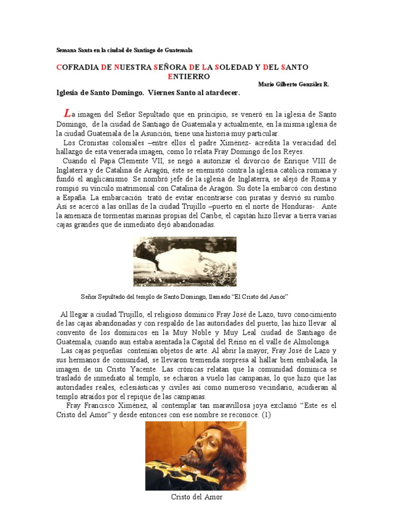 Don Vctor Miguel Daz, dice de ella: Adems de los detalles anatmicos, de la bien estudiada, actitud del cuerpo, presenta un inmenso sentimiento en el rostro, cubierto por el tinte plido de la muerte: todo en la bella imagen es sobrio y correcto, la cabeza tiene cortos bucles y se apoya sobre una almohada, los labios ligeramente abiertos, los ojos cerrados, la nariz perfilada y la frente amplia y hermosa (2) Despus del traslado de la ciudad capital del Reino del valle de Almolonga al valle de Panchoy, la iglesia y el convento de Santo Domingo, estuvieron enclavados en el barrio del mismo nombre al norte de la ciudad de Santiago de Guatemala y fue residencia de familias nobles. Tuvo por vecindad al barrio de la Candelaria. Cuatro solares le asign el Noble Ayuntamiento en 1541 a la comunidad dominica y otro cuatro ms se adquirieron por compra. As lograron edificar incluso- el Colegio de Santo Toms de Aquino, donde tiempo despus se fund la Real y Pontificia Universidad de San Carlos de Borromeo y calle de por medio al convento, el hospital de San Alejo. El convento fue cabeza de la Provincia de San Vicente de Chiapas y Guatemala. La calle de la Nobleza pasaba al frente. La iglesia que primero fue de caas tapadas con barro y tejado de heno lleg a ser al correr del tiempo- de slida construccin y de una belleza impresionante. Los canteros Juan Bautista de Vallejo y Martn de Autillo , en 1616 se comprometieron a construir el arco toral de piedra de cantera. as, aquel edificio pona de manifiesto el gusto de los frailes dominicos. Las Bvedas se vean ornamentadas con arabescos y cabezas de serafines en relieves; se ostentaba en su camarin la Virgen del Rosario, que es de platatuvo aquel convento notables cuadros de pintores criollos y espaoles, entre los que sobresala un apostolado del taller de Zurbirnas como candelabros de plata, candiles, altares magnficos, que construyeron los artistas del pas (3) desde la publicacin de la Bula del Sr. Clemente VII (1523-1534) que mand erigir cofradas en celebracin de la muerte y sepultura de N. S. Jesucristo, tuvo principio en el Convento de Sto. Domingo de Guatemala, la cofrada de ese ttulo que existe hasta el da de hoy y de la cual han sido Mayordomos los sujetos ms visibles de esta ciudad entre los que ms se distinguieron antiguamente por su devocin a este ministerio y empeo en solemnizar la funcin del Sto. Entierro del Redentor del mundo fue uno el Capitn Alonso Gil Moreno que coste de su peculio el suntuoso retablo que la cofrada tena en su capilla de la iglesia de Sto. Domingo y la Urna de carey con incrustaciones de plata que serva en la procesin que la misma Cofrada saca el Viernes Sto. Por los aos de 1595 hubo respecto a esta festividad una competencia entre los PP. Dominicos y los Franciscanos que tambin la celebraban en su Iglesia y al fin se convino en que estos ultimos hicieran su funcion del descendimiento de la Cruz en su Iglesia y quedase a los primeros el privilegio de sacar la solemne procesion del entierro del seor, convenio que se redujo a escritura publica para perpetuar memoria. El Ayuntamiento de esta Capital fue siempre patrono de esta cofrada tomando sus capitulares participo en la funcion de su instituto ya llevando los estandartes, ya las insignias de la pasin ya otros smbolos, en la gran procesin del Viernes Santo. Por este ao de 1650 en que vamos, el Mayordomo principal que lo era D. Antonio del Rizo, caballero originario de Oaxaca, dio nuevo impulso esta celebridad y dispuso definitivamente la forma y orden de la procesin, que, poco mas o menos, es el mismo que se guarda hasta el dia de hoy. Como esta procesin es tal vez la mas solemne y augusta de tres siglos, hemos credo consignar aqu estas noticias que de ellas nos da el Cronista Ximnez en el c. 82 del Lib. 4. De su historia (4) Por la nota anterior, parece que el ao de 1650 fue de mucho esplendor para la procesin del Santo entierro. El Padre Ximenez agrega que concurriendo a ella todo lo mas lucido de la ciudad, ya con la mucha cera, ya con la penitencia que sale, ya con