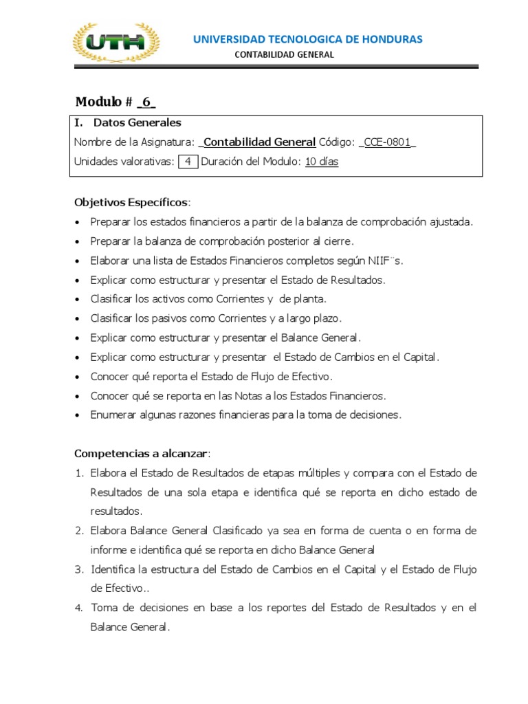 I. Datos Generales Nombre de la Asignatura: _Contabilidad General Cdigo: _CCE-0801_ Unidades valorativas: 4 Duracin del Modulo: 10 das