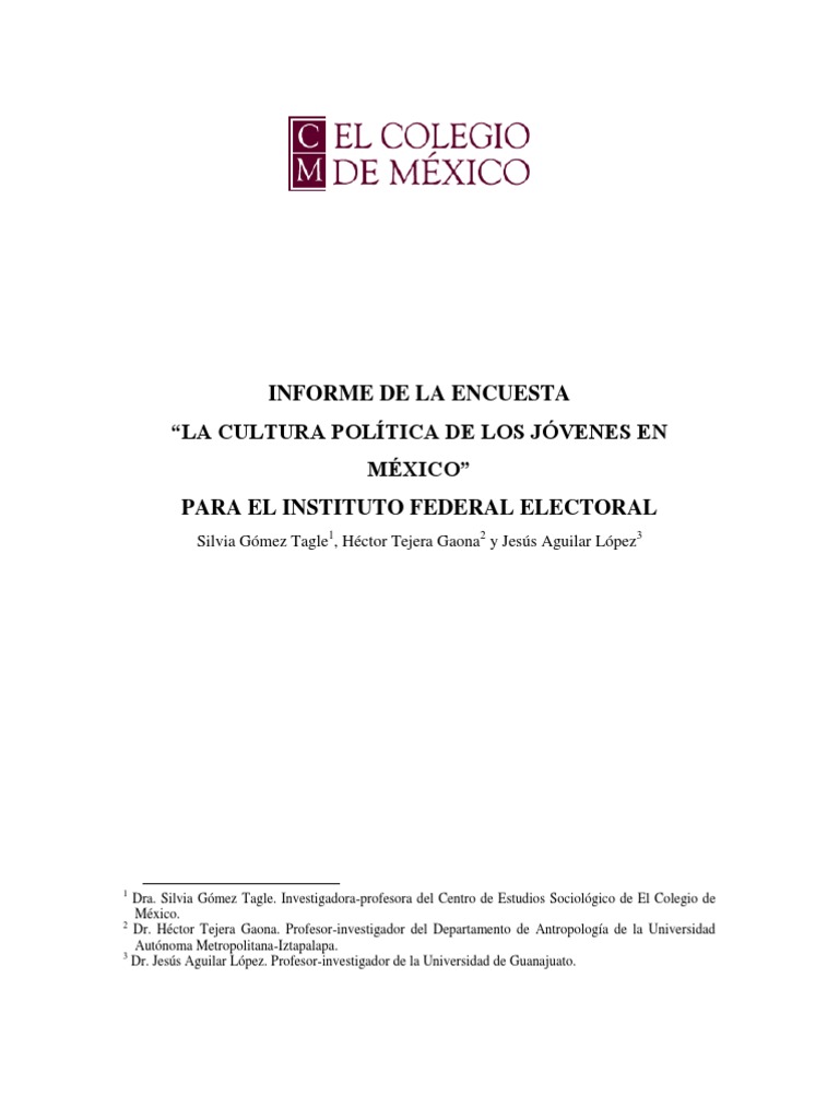 Dra. Silvia Gmez Tagle. Investigadora-profesora del Centro de Estudios Sociolgico de El Colegio de Mxico. 2 Dr. Hctor Tejera Gaona. Profesor-investigador del Departamento de Antropologa de la Universidad Autnoma Metropolitana-Iztapalapa. 3 Dr. Jess Aguilar Lpez. Profesor-investigador de la Universidad de Guanajuato.