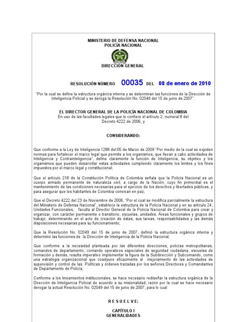 00035 del 08 de enero de 2010 Pgina 2 de 23 CONTINUACIN DE LA RESOLUCIN POR LA CUAL SE DEFINE LA ESTRUCTURA ORGNICA INTERNA Y SE DETERMINAN LAS FUNCIONES DE LA DIRECCIN DE INTELIGENCIA POLICIAL, Y SE DEROGA LA RESOLUCIN NO. 02049 DEL 15 DE JUNIO DE 2007.