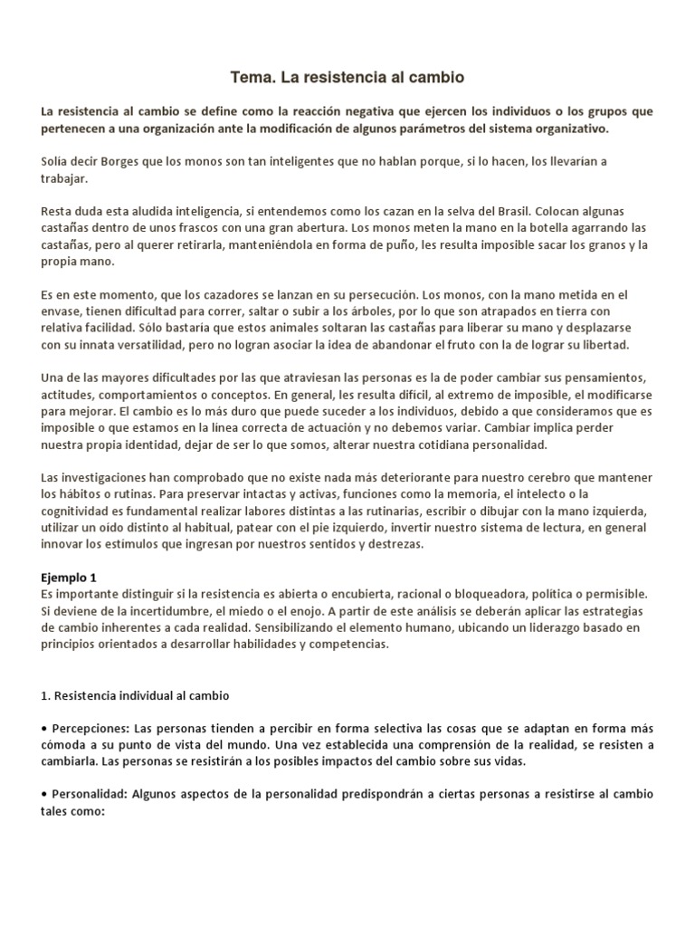 La resistencia al cambio se define como la reaccin negativa que ejercen los individuos o los grupos que pertenecen a una organizacin ante la modificacin de algunos parmetros del sistema organizativo. Sola decir Borges que los monos son tan inteligentes que no hablan porque, si lo hacen, los llevaran a trabajar. Resta duda esta aludida inteligencia, si entendemos como los cazan en la selva del Brasil. Colocan algunas castaas dentro de unos frascos con una gran abertura. Los monos meten la mano en la botella agarrando las castaas, pero al querer retirarla, mantenindola en forma de puo, les resulta imposible sacar los granos y la propia mano. Es en este momento, que los cazadores se lanzan en su persecucin. Los monos, con la mano metida en el envase, tienen dificultad para correr, saltar o subir a los rboles, por lo que son atrapados en tierra con relativa facilidad. Slo bastara que estos animales soltaran las castaas para liberar su mano y desplazarse con su innata versatilidad, pero no logran asociar la idea de abandonar el fruto con la de lograr su libertad. Una de las mayores dificultades por las que atraviesan las personas es la de poder cambiar sus pensamientos, actitudes, comportamientos o conceptos. En general, les resulta difcil, al extremo de imposible, el modificarse para mejorar. El cambio es lo ms duro que puede suceder a los individuos, debido a que consideramos que es imposible o que estamos en la lnea correcta de actuacin y no debemos variar. Cambiar implica perder nuestra propia identidad, dejar de ser lo que somos, alterar nuestra cotidiana personalidad. Las investigaciones han comprobado que no existe nada ms deteriorante para nuestro cerebro que mantener los hbitos o rutinas. Para preservar intactas y activas, funciones como la memoria, el intelecto o la cognitividad es fundamental realizar labores distintas a las rutinarias, escribir o dibujar con la mano izquierda, utilizar un odo distinto al habitual, patear con el pie izquierdo, invertir nuestro sistema de lectura, en general innovar los estmulos que ingresan por nuestros sentidos y destrezas. Ejemplo 1 Es importante distinguir si la resistencia es abierta o encubierta, racional o bloqueadora, poltica o permisible. Si deviene de la incertidumbre, el miedo o el enojo. A partir de este anlisis se debern aplicar las estrategias de cambio inherentes a cada realidad. Sensibilizando el elemento humano, ubicando un liderazgo basado en principios orientados a desarrollar habilidades y competencias.
