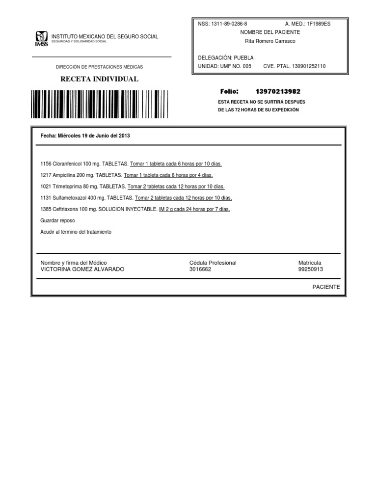 1156 Cloranfenicol 100 mg. TABLETAS. Tomar 1 tableta cada 6 horas por 10 das. 1217 Ampicilina 200 mg. TABLETAS. Tomar 1 tableta cada 6 horas por 4 das. 1021 Trimetoprima 80 mg. TABLETAS. Tomar 2 tabletas cada 12 horas por 10 das. 1131 Sulfametoxazol 400 mg. TABLETAS. Tomar 2 tabletas cada 12 horas por 10 das. 1385 Ceftriaxona 100 mg. SOLUCION INYECTABLE. IM 2 g cada 24 horas por 7 das. Guardar reposo Acudir al trmino del tratamiento