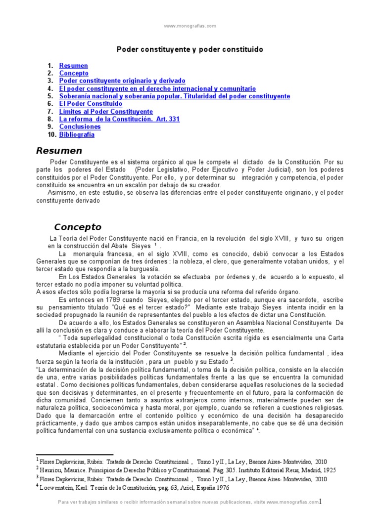 Poder Constituyente es el sistema orgnico al que le compete el dictado de la Constitucin. Por su parte los poderes del Estado (Poder Legislativo, Poder Ejecutivo y Poder Judicial), son los poderes constituidos por el Poder Constituyente. Por ello, y por determinar su integracin y competencia, el poder constituido se encuentra en un escaln por debajo de su creador. Asimismo, en este estudio, se observa las diferencias entre el poder constituyente originario, y el poder constituyente derivado