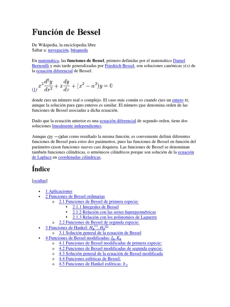 1 Aplicaciones 2 Funciones de Bessel ordinarias o 2.1 Funciones de Bessel de primera especie: 2.1.1 Integrales de Bessel 2.1.2 Relacin con las series hipergeomtricas 2.1.3 Relacin con los polinomios de Laguerre o 2.2 Funciones de Bessel de segunda especie: 3 Funciones de Hankel: H(1), H(2) o 3.1 Solucin general de la ecuacin de Bessel 4 Funciones de Bessel modificadas: I, K o 4.1 Funciones de Bessel modificadas de primera especie: o 4.2 Funciones de Bessel modificadas de segunda especie: o 4.3 Solucin general de la ecuacin de Bessel modificada o 4.4 Funciones esfricas de Bessel: o 4.5 Funciones de Hankel esfricas: h n