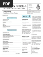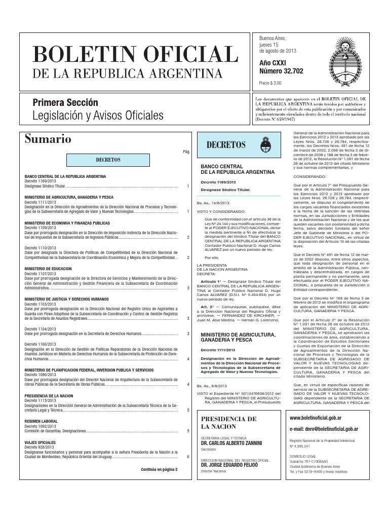 BANCO CENTRAL DE LA REPUBLICA ARGENTINA Decreto 1169/2013 Desgnase Sndico Titular............................................................................................................. MINISTERIO DE AGRICULTURA, GANADERIA Y PESCA Decreto 1111/2013 Designacin en la Direccin de Agroalimentos de la Direccin Nacional de Procesos y Tecnologas de la Subsecretara de Agregado de Valor y Nuevas Tecnologas........................................... MINISTERIO DE ECONOMIA Y FINANZAS PUBLICAS Decreto 1109/2013 Dase por prorrogada designacin en la Direccin de Imposicin Indirecta de la Direccin Nacional de Impuestos de la Subsecretara de Ingresos Pblicos.......................................................... Decreto 1110/2013 Dase por designada la Directora de Polticas de Competitividad de la Direccin Nacional de Competitividad de la Subsecretara de Coordinacin Econmica y Mejora de la Competitividad.... MINISTERIO DE EDUCACION Decreto 1107/2013 Dase por prorrogada designacin de la Directora de Servicios y Mantenimiento de la Direccin General de Administracin y Gestin Financiera de la Subsecretara de Coordinacin Administrativa............................................................................................................................ MINISTERIO DE JUSTICIA Y DERECHOS HUMANOS Decreto 1103/2013 Dase por prorrogada designacin en la Direccin Nacional del Registro Unico de Aspirantes a Guarda con Fines Adoptivos de la Subsecretara de Coordinacin y Control de Gestin Registral de la Secretara de Asuntos Registrales.. ...................................................................................... Decreto 1104/2013 Dase por prorrogada designacin en la Secretara de Derechos Humanos.................................... Decreto 1166/2013 Designacin en la Direccin de Gestin de Polticas Reparatorias de la Direccin Nacional de Asuntos Jurdicos en Materia de Derechos Humanos de la Subsecretara de Proteccin de Derechos Humanos............................................................................................................................. MINISTERIO DE PLANIFICACION FEDERAL, INVERSION PUBLICA Y SERVICIOS Decreto 1096/2013 Dase por prorrogada designacin del Director Nacional de Arquitectura de la Subsecretara de Obras Pblicas de la Secretara de Obras Pblicas....................................................................... PRESIDENCIA DE LA NACION Decreto 1115/2013 Designaciones en la Direccin General de Administracin de la Subsecretara Tcnica de la Secretara Legal y Tcnica............................................................................................................... REGIMEN LABORAL Decreto 1092/2013 Comisin de Garantas. Designaciones......................................................................................... VIAJES OFICIALES Decreto 928/2013 Desgnanse funcionarios y personal para acompaar a la seora Presidenta de la Nacin a la Ciudad de Montevideo, Repblica Oriental del Uruguay................................................................ Contina en pgina 2
