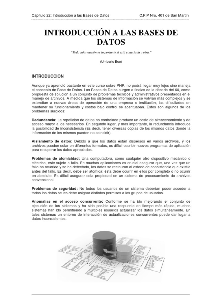 Aunque ya aprendi bastante en este curso sobre PHP, no podr llegar muy lejos sino maneja el concepto de Base de Datos. Las Bases de Datos surgen a finales de la dcada del 60, como propuesta de solucin a un conjunto de problemas tcnicos y administrativos presentados en el manejo de archivos. A medida que los sistemas de informacin se volvan ms complejos y se extendan a nuevas reas de operacin de una empresa o institucin, las dificultades en mantener su funcionamiento y costos bajo control se acentuaban. Estos son algunos de los problemas surgidos: Redundancia: La repeticin de datos no controlada produce un costo de almacenamiento y de acceso mayor a los necesarios. En segundo lugar, y mas importante, la redundancia introduce la posibilidad de inconsistencia (Es decir, tener diversas copias de los mismos datos donde la informacin de los mismos pueden no coincidir). Aislamiento de datos: Debido a que los datos estn dispersos en varios archivos, y los archivos pueden estar en diferentes formatos, es difcil escribir nuevos programas de aplicacin para recuperar los datos apropiados. Problemas de atomicidad: Una computadora, como cualquier otro dispositivo mecnico o elctrico, este sujeto a fallo. En muchas aplicaciones es crucial asegurar que, una vez que un fallo ha ocurrido y se ha detectado, los datos se restauran al estado de consistencia que exista antes del fallo. Es decir, debe ser atmica: sta debe ocurrir en ellos por completo o no ocurrir en absoluto. Es difcil asegurar esta propiedad en un sistema de procesamiento de archivos convencional. Problemas de seguridad: No todos los usuarios de un sistema deberan poder acceder a todos los datos se les debe asignar distintos permisos a los grupos de usuarios. Anomalas en el acceso concurrente: Conforme se ha ido mejorando el conjunto de ejecucin de los sistemas y ha sido posible una respuesta en tiempo ms rpida, muchos sistemas han ido permitiendo a mltiples usuarios actualizar los datos simultneamente. En tales sistemas un entorno de interaccin de actualizaciones concurrentes puede dar lugar a datos inconsistentes.