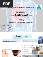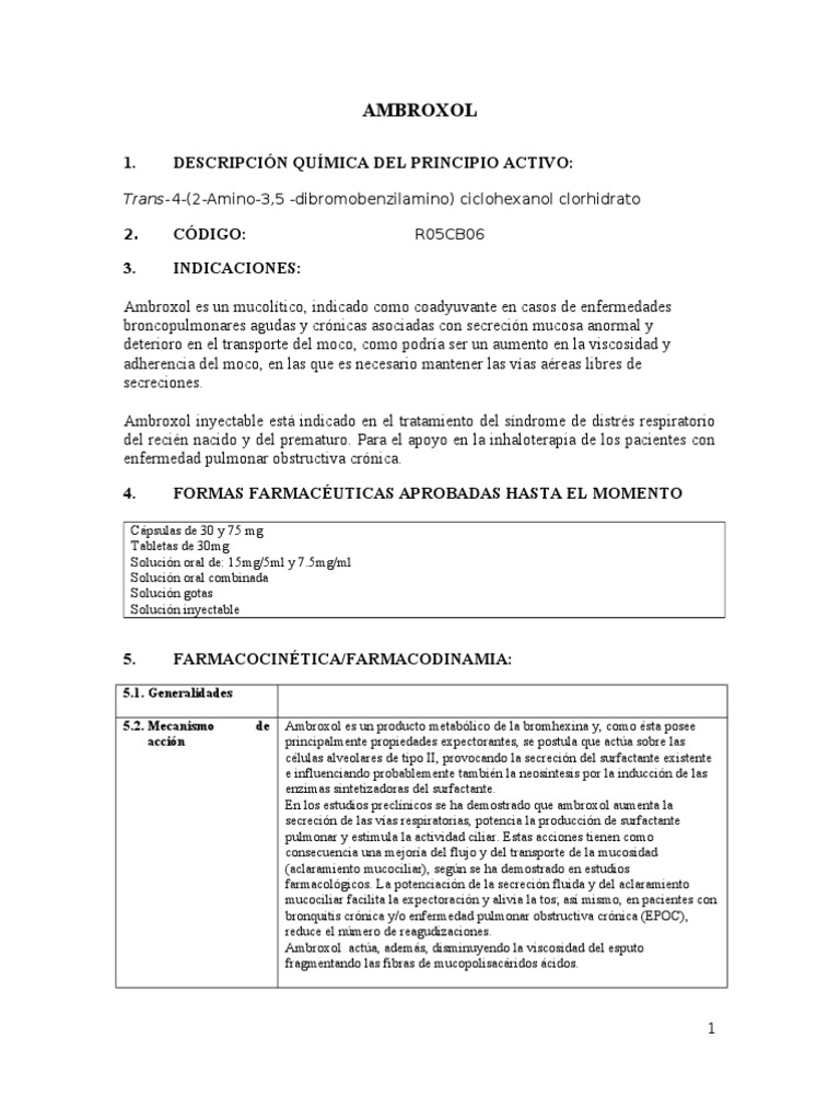 5.1. Generalidades 5.2. Mecanismo accin de Ambroxol es un producto metablico de la bromhexina y, como sta posee principalmente propiedades expectorantes, se postula que acta sobre las clulas alveolares de tipo II, provocando la secrecin del surfactante existente e influenciando probablemente tambin la neosntesis por la induccin de las enzimas sintetizadoras del surfactante. En los estudios preclnicos se ha demostrado que ambroxol aumenta la secrecin de las vas respiratorias, potencia la produccin de surfactante pulmonar y estimula la actividad ciliar. Estas acciones tienen como consecuencia una mejora del flujo y del transporte de la mucosidad (aclaramiento mucociliar), segn se ha demostrado en estudios farmacolgicos. La potenciacin de la secrecin fluida y del aclaramiento mucociliar facilita la expectoracin y alivia la tos; as mismo, en pacientes con bronquitis crnica y/o enfermedad pulmonar obstructiva crnica (EPOC), reduce el nmero de reagudizaciones. Ambroxol acta, adems, disminuyendo la viscosidad del esputo fragmentando las fibras de mucopolisacridos cidos.