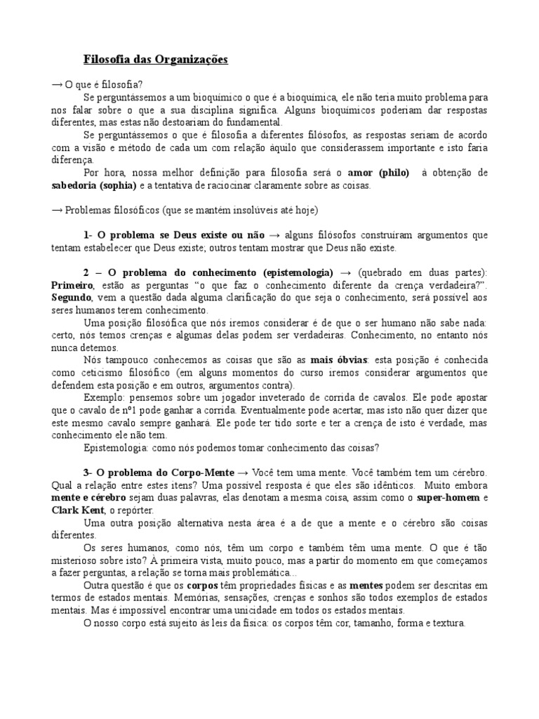 O que filosofia? Se perguntssemos a um bioqumico o que a bioqumica, ele no teria muito problema para nos falar sobre o que a sua disciplina significa. Alguns bioqumicos poderiam dar respostas diferentes, mas estas no destoariam do fundamental. Se perguntssemos o que filosofia a diferentes filsofos, as respostas seriam de acordo com a viso e mtodo de cada um com relao quilo que considerassem importante e isto faria diferena. Por hora, nossa melhor definio para filosofia ser o amor (philo) obteno de sabedoria (sophia) e a tentativa de raciocinar claramente sobre as coisas. Problemas filosficos (que se mantm insolveis at hoje) 1- O problema se Deus existe ou no alguns filsofos construram argumentos que tentam estabelecer que Deus existe; outros tentam mostrar que Deus no existe. 2 O problema do conhecimento (epistemologia) (quebrado em duas partes): Primeiro, esto as perguntas o que faz o conhecimento diferente da crena verdadeira?. Segundo, vem a questo dada alguma clarificao do que seja o conhecimento, ser possvel aos seres humanos terem conhecimento. Uma posio filosfica que ns iremos considerar de que o ser humano no sabe nada: certo, ns temos crenas e algumas delas podem ser verdadeiras. Conhecimento, no entanto ns nunca detemos. Ns tampouco conhecemos as coisas que so as mais bvias: esta posio conhecida como ceticismo filosfico (em alguns momentos do curso iremos considerar argumentos que defendem esta posio e em outros, argumentos contra). Exemplo: pensemos sobre um jogador inveterado de corrida de cavalos. Ele pode apostar que o cavalo de n1 pode ganhar a corrida. Eventualmente pode acertar, mas isto no quer dizer que este mesmo cavalo sempre ganhar. Ele pode ter tido sorte e ter a crena de isto verdade, mas conhecimento ele no tem. Epistemologia: como ns podemos tomar conhecimento das coisas? 3- O problema do Corpo-Mente Voc tem uma mente. Voc tambm tem um crebro. Qual a relao entre estes itens? Uma possvel resposta que eles so idnticos. Muito embora mente e crebro sejam duas palavras, elas denotam a mesma coisa, assim como o super-homem e Clark Kent, o reprter. Uma outra posio alternativa nesta rea a de que a mente e o crebro so coisas diferentes. Os seres humanos, como ns, tm um corpo e tambm tm uma mente. O que to misterioso sobre isto? primeira vista, muito pouco, mas a partir do momento em que comeamos a fazer perguntas, a relao se torna mais problemtica... Outra questo que os corpos tm propriedades fsicas e as mentes podem ser descritas em termos de estados mentais. Memrias, sensaes, crenas e sonhos so todos exemplos de estados mentais. Mas impossvel encontrar uma unicidade em todos os estados mentais. O nosso corpo est sujeito s leis da fsica: os corpos tm cor, tamanho, forma e textura.