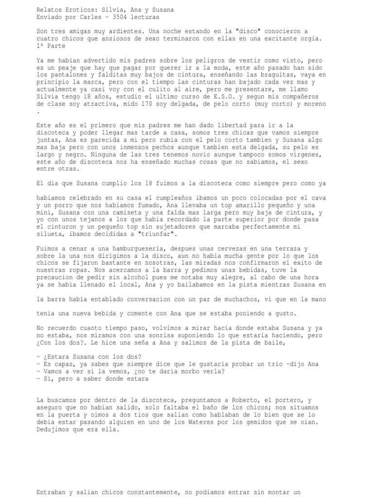 Una noche estando en la "disco" conocieron a cuatro chicos que ansiosos de sexo terminaron con ellas en una excitante orgia. 1 Parte Ya me habian advertido mis padres sobre los peligros de vestir como visto, pero es un peaje que hay que pagar por querer ir a la moda, este ao pasado han sido los pantalones y falditas muy bajos de cintura, enseando las braguitas, vaya en principio la marca, pero con el tiempo las cinturas han bajado cada vez mas y actualmente ya casi voy con el culito al aire, pero me presentare, me llamo Silvia tengo 18 aos, estudio el ultimo curso de E.S.O. y segun mis compaeros de clase soy atractiva, mido 170 soy delgada, de pelo corto (muy corto) y moreno . Este ao es el primero que mis padres me han dado libertad para ir a la discoteca y poder llegar mas tarde a casa, somos tres chicas que vamos siempre juntas, Ana es parecida a mi pero rubia con el pelo corto tambien y Susana algo mas baja pero con unos inmensos pechos aunque tambien esta delgada, su pelo es largo y negro. Ninguna de las tres tenemos novio aunque tampoco somos virgenes, este ao de discoteca nos ha enseado muchas cosas que no sabiamos, el sexo entre otras. El dia que Susana cumplio los 18 fuimos a la discoteca como siempre pero como ya habiamos celebrado en su casa el cumpleaos ibamos un poco colocadas por el cava y un porro que nos habiamos fumado, Ana llevaba un top amarillo pequeo y una mini, Susana con una camiseta y una falda mas larga pero muy baja de cintura, y yo con unos tejanos a los que habia recordado la parte superior por donde pasa el cinturon y un pequeo top sin sujetadores que marcaba perfectamente mi silueta, ibamos decididas a "triunfar". Fuimos a cenar a una hamburgueseria, despues unas cervezas en una terraza y sobre la una nos dirigimos a la disco, aun no habia mucha gente por lo que los chicos se fijaron bastante en nosotras, las miradas nos confirmaron el exito de nuestras ropas. Nos acercamos a la barra y pedimos unas bebidas, tuve la precaucion de pedir sin alcohol pues me notaba muy alegre, al cabo de una hora ya se habia llenado el local, Ana y yo bailabamos en la pista mientras Susana en la barra habia entablado conversacion con un par de muchachos, vi que en la mano tenia una nueva bebida y comente con Ana que se estaba poniendo a gusto. No recuerdo cuanto tiempo paso, volvimos a mirar hacia donde estaba Susana y ya no estaba, nos miramos con una sonrisa suponiendo lo que estaria haciendo, pero Con los dos?. Le hice una sea a Ana y salimos de la pista de baile, Estara Susana con los dos? Es capaz, ya sabes que siempre dice que le gustaria probar un trio -dijo Ana Vamos a ver si la vemos, no te daria morbo verla? Si, pero a saber donde estara