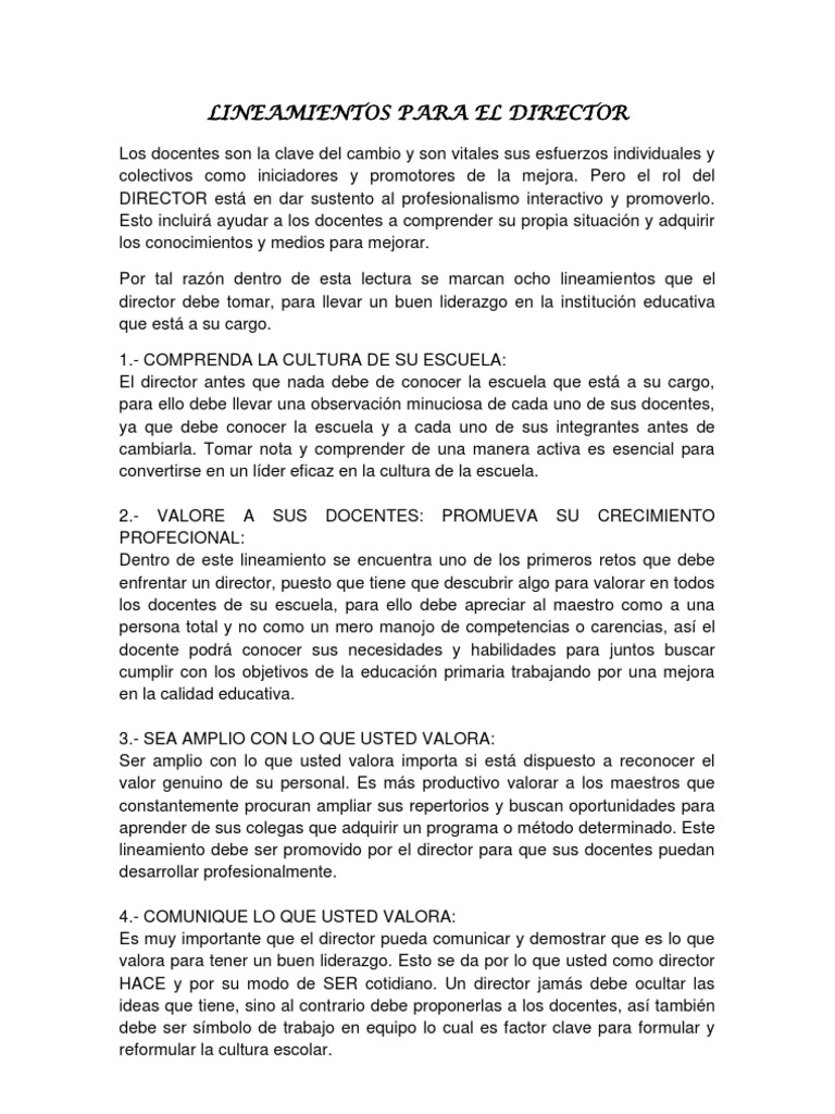 Los docentes son la clave del cambio y son vitales sus esfuerzos individuales y colectivos como iniciadores y promotores de la mejora. Pero el rol del DIRECTOR est en dar sustento al profesionalismo interactivo y promoverlo. Esto incluir ayudar a los docentes a comprender su propia situacin y adquirir los conocimientos y medios para mejorar. Por tal razn dentro de esta lectura se marcan ocho lineamientos que el director debe tomar, para llevar un buen liderazgo en la institucin educativa que est a su cargo. 1.- COMPRENDA LA CULTURA DE SU ESCUELA: El director antes que nada debe de conocer la escuela que est a su cargo, para ello debe llevar una observacin minuciosa de cada uno de sus docentes, ya que debe conocer la escuela y a cada uno de sus integrantes antes de cambiarla. Tomar nota y comprender de una manera activa es esencial para convertirse en un lder eficaz en la cultura de la escuela. 2.- VALORE A SUS DOCENTES: PROMUEVA SU CRECIMIENTO PROFECIONAL: Dentro de este lineamiento se encuentra uno de los primeros retos que debe enfrentar un director, puesto que tiene que descubrir algo para valorar en todos los docentes de su escuela, para ello debe apreciar al maestro como a una persona total y no como un mero manojo de competencias o carencias, as el docente podr conocer sus necesidades y habilidades para juntos buscar cumplir con los objetivos de la educacin primaria trabajando por una mejora en la calidad educativa. 3.- SEA AMPLIO CON LO QUE USTED VALORA: Ser amplio con lo que usted valora importa si est dispuesto a reconocer el valor genuino de su personal. Es ms productivo valorar a los maestros que constantemente procuran ampliar sus repertorios y buscan oportunidades para aprender de sus colegas que adquirir un programa o mtodo determinado. Este lineamiento debe ser promovido por el director para que sus docentes puedan desarrollar profesionalmente. 4.- COMUNIQUE LO QUE USTED VALORA: Es muy importante que el director pueda comunicar y demostrar que es lo que valora para tener un buen liderazgo. Esto se da por lo que usted como director HACE y por su modo de SER cotidiano. Un director jams debe ocultar las ideas que tiene, sino al contrario debe proponerlas a los docentes, as tambin debe ser smbolo de trabajo en equipo lo cual es factor clave para formular y reformular la cultura escolar.