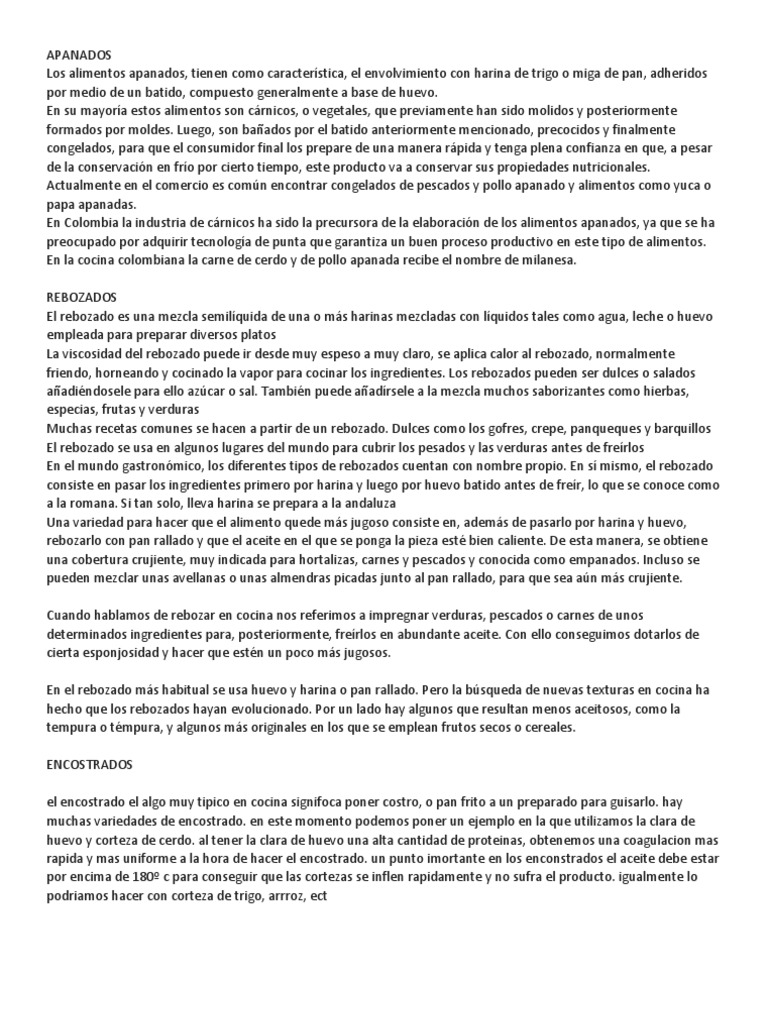 medio de un batido, compuesto generalmente a base de huevo. En su mayora estos alimentos son crnicos, o vegetales, que previamente han sido molidos y posteriormente formados por moldes. Luego, son baados por el batido anteriormente mencionado, precocidos y finalmente congelados, para que el consumidor final los prepare de una manera rpida y tenga plena confianza en que, a pesar de la conservacin en fro por cierto tiempo, este producto va a conservar sus propiedades nutricionales. Actualmente en el comercio es comn encontrar congelados de pescados y pollo apanado y alimentos como yuca o papa apanadas. En Colombia la industria de crnicos ha sido la precursora de la elaboracin de los alimentos apanados, ya que se ha preocupado por adquirir tecnologa de punta que garantiza un buen proceso productivo en este tipo de alimentos. En la cocina colombiana la carne de cerdo y de pollo apanada recibe el nombre de milanesa. REBOZADOS El rebozado es una mezcla semilquida de una o ms harinas mezcladas con lquidos tales como agua, leche o huevo empleada para preparar diversos platos La viscosidad del rebozado puede ir desde muy espeso a muy claro, se aplica calor al rebozado, normalmente friendo, horneando y cocinado la vapor para cocinar los ingredientes. Los rebozados pueden ser dulces o salados aadindosele para ello azcar o sal. Tambin puede aadrsele a la mezcla muchos saborizantes como hierbas, especias, frutas y verduras Muchas recetas comunes se hacen a partir de un rebozado. Dulces como los gofres, crepe, panqueques y barquillos El rebozado se usa en algunos lugares del mundo para cubrir los pesados y las verduras antes de frerlos En el mundo gastronmico, los diferentes tipos de rebozados cuentan con nombre propio. En s mismo, el rebozado consiste en pasar los ingredientes primero por harina y luego por huevo batido antes de frer, lo que se conoce como a la romana. Si tan solo, lleva harina se prepara a la andaluza Una variedad para hacer que el alimento quede ms jugoso consiste en, adems de pasarlo por harina y huevo, rebozarlo con pan rallado y que el aceite en el que se ponga la pieza est bien caliente. De esta manera, se obtiene una cobertura crujiente, muy indicada para hortalizas, carnes y pescados y conocida como empanados. Incluso se pueden mezclar unas avellanas o unas almendras picadas junto al pan rallado, para que sea an ms crujiente. Cuando hablamos de rebozar en cocina nos referimos a impregnar verduras, pescados o carnes de unos determinados ingredientes para, posteriormente, frerlos en abundante aceite. Con ello conseguimos dotarlos de cierta esponjosidad y hacer que estn un poco ms jugosos. En el rebozado ms habitual se usa huevo y harina o pan rallado. Pero la bsqueda de nuevas texturas en cocina ha hecho que los rebozados hayan evolucionado. Por un lado hay algunos que resultan menos aceitosos, como la tempura o tmpura, y algunos ms originales en los que se emplean frutos secos o cereales. ENCOSTRADOS el encostrado el algo muy tipico en cocina signifoca poner costro, o pan frito a un preparado para guisarlo. hay muchas variedades de encostrado. en este momento podemos poner un ejemplo en la que utilizamos la clara de huevo y corteza de cerdo. al tener la clara de huevo una alta cantidad de proteinas, obtenemos una coagulacion mas rapida y mas uniforme a la hora de hacer el encostrado. un punto imortante en los enconstrados el aceite debe estar por encima de 180 c para conseguir que las cortezas se inflen rapidamente y no sufra el producto. igualmente lo podriamos hacer con corteza de trigo, arrroz, ect