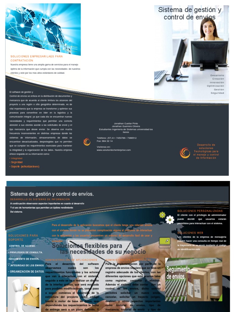 El software de gestin y Control de envos se enfoca en la distribucin de documentos y mercanca que de acuerdo al cliente limitara los alcances del proyecto a una regin o sitio geogrfico determinado, es de vital importancia que la empresa se transforme y optimice sus procesos para convertirse en lder en la logstica y la comunicacin integral; ya que cada da se encuentran nuevas necesidades y requerimientos que permitan una correcta atencin a sus clientes acorde a las solicitudes de envi y el tipo mercanca que desee enviar. Se observa con mucha frecuencia inconvenientes en distintas empresas donde los sistemas de informacin, almacenamiento de datos se encuentran desactualizados, desprotegidos que no permiten que se cumplan los requerimientos esenciales para mantener la integridad y la organizacin de los datos. Nuestra empresa ofrece respaldo en su informacin como: