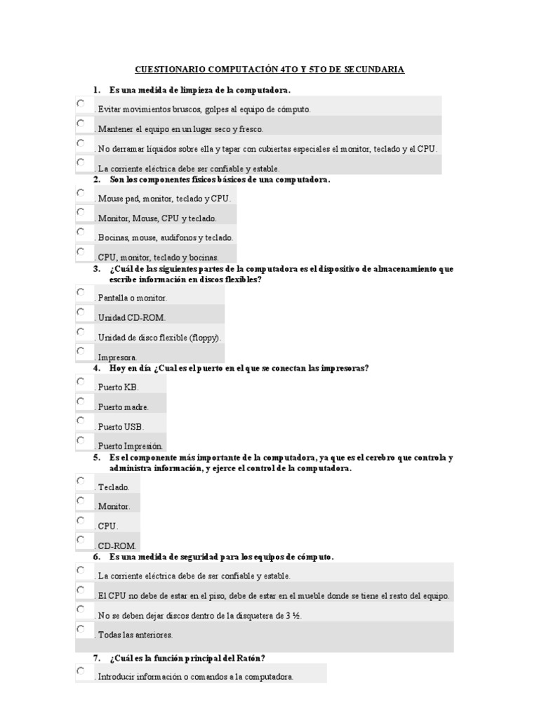 . Evitar movimientos bruscos, golpes al equipo de cmputo. . Mantener el equipo en un lugar seco y fresco. . No derramar lquidos sobre ella y tapar con cubiertas especiales el monitor, teclado y el CPU. . La corriente elctrica debe ser confiable y estable. 2. Son los componentes fsicos bsicos de una computadora. . Mouse pad, monitor, teclado y CPU. . Monitor, Mouse, CPU y teclado. . Bocinas, mouse, audifonos y teclado. . CPU, monitor, teclado y bocinas. 3. Cul de las siguientes partes de la computadora es el dispositivo de almacenamiento que escribe informacin en discos flexibles? . Pantalla o monitor. . Unidad CD-ROM. . Unidad de disco flexible (floppy). . Impresora. 4. Hoy en da Cual es el puerto en el que se conectan las impresoras? . Puerto KB. . Puerto madre. . Puerto USB. . Puerto Impresin. 5. Es el componente ms importante de la computadora, ya que es el cerebro que controla y administra informacin, y ejerce el control de la computadora. . Teclado. . Monitor. . CPU. . CD-ROM. 6. Es una medida de seguridad para los equipos de cmputo. . La corriente elctrica debe de ser confiable y estable. . El CPU no debe de estar en el piso, debe de estar en el mueble donde se tiene el resto del equipo. . No se deben dejar discos dentro de la disquetera de 3 . . Todas las anteriores. 7. Cul es la funcin principal del Ratn?