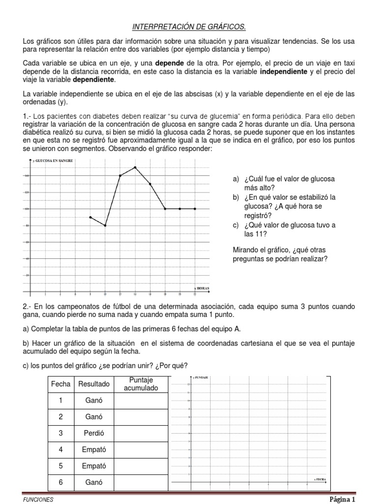 Se los usa para representar la relacin entre dos variables (por ejemplo distancia y tiempo) Cada variable se ubica en un eje, y una depende de la otra. Por ejemplo, el precio de un viaje en taxi depende de la distancia recorrida, en este caso la distancia es la variable independiente y el precio del viaje la variable dependiente. La variable independiente se ubica en el eje de las abscisas (x) y la variable dependiente en el eje de las ordenadas (y). 1.- Los pacientes con diabetes deben realizar su curva de glucemia en forma peridica. Para ello deben registrar la variacin de la concentracin de glucosa en sangre cada 2 horas durante un da. Una persona diabtica realiz su curva, si bien se midi la glucosa cada 2 horas, se puede suponer que en los instantes en que esta no se registr fue aproximadamente igual a la que se indica en el grfico, por eso los puntos se unieron con segmentos. Observando el grfico responder:
