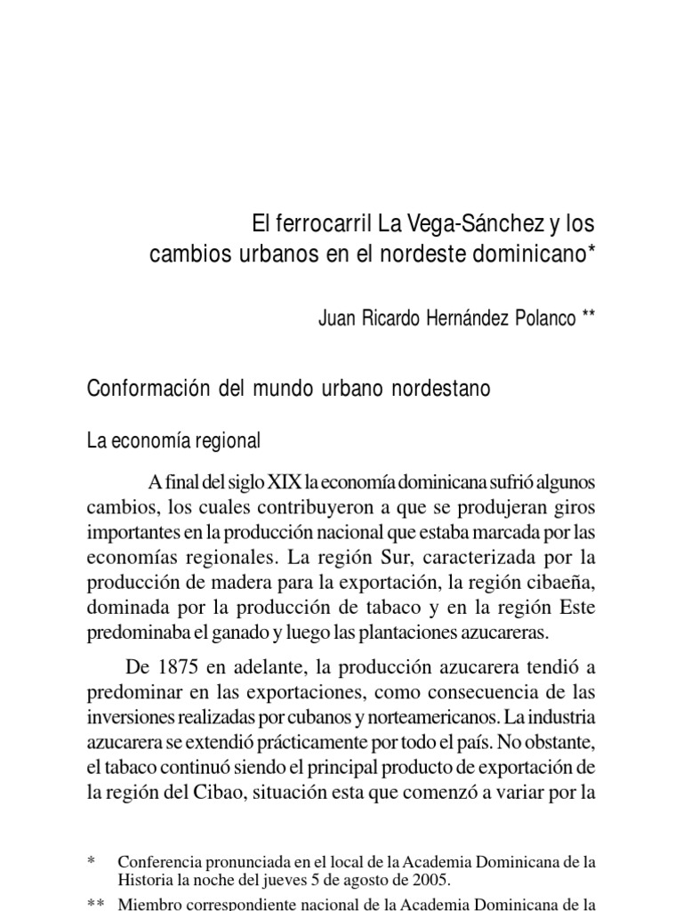 de la obra, ofreciendo y comprando terrenos por donde se prevea que pasara la lnea frrea. Este medio de transporte fue concebido para recorrer el tramo de Santiago a Saman, pero nunca lleg a este ltimo lugar. El puerto utilizado fue el de Snchez, originalmente conocido como Las Caitas. En principio, la ruta que recorri el ferrocarril fue la siguiente: Snchez-La Vega; ms adelante, extendi sus redes hacia San Francisco de Macors, Salcedo y Moca, logrando conectarse con el Ferrocarril Santiago-Puerto Plata. Los rieles tambin tocaron comunidades como Pimentel y Almacn; a esta ltima, luego se le asign el nombre de Villa Riva en honor a Gregorio Riva. La puesta en funcionamiento de manera definitiva del ferrocarril se logr en el 1884, debido a la escasez de mano de obra, la interferencia de los torrenciales aguaceros y la consecuente crecida de los ros Yuna y Cam, entre otros factores.7 No obstante, a la ciudad de La Vega lleg en el 1887. Por las razones que hemos expuesto, fue muy traumtico lograr el desplazamiento normal de esta mquina en el marco de la ruta concebida. As que la puesta en funcionamiento del ferrocarril tendra un impacto importante en las actividades agrcolas y en los centros urbanos de la regin. El puerto de Snchez alcanz la condicin de puerta del nordeste y de ciudades como La Vega, Moca y, en cierta medida, de Santiago. Las tierras por donde atravesaba el ferrocarril adquirieron mayor valor econmico, pero adems muchas personas se